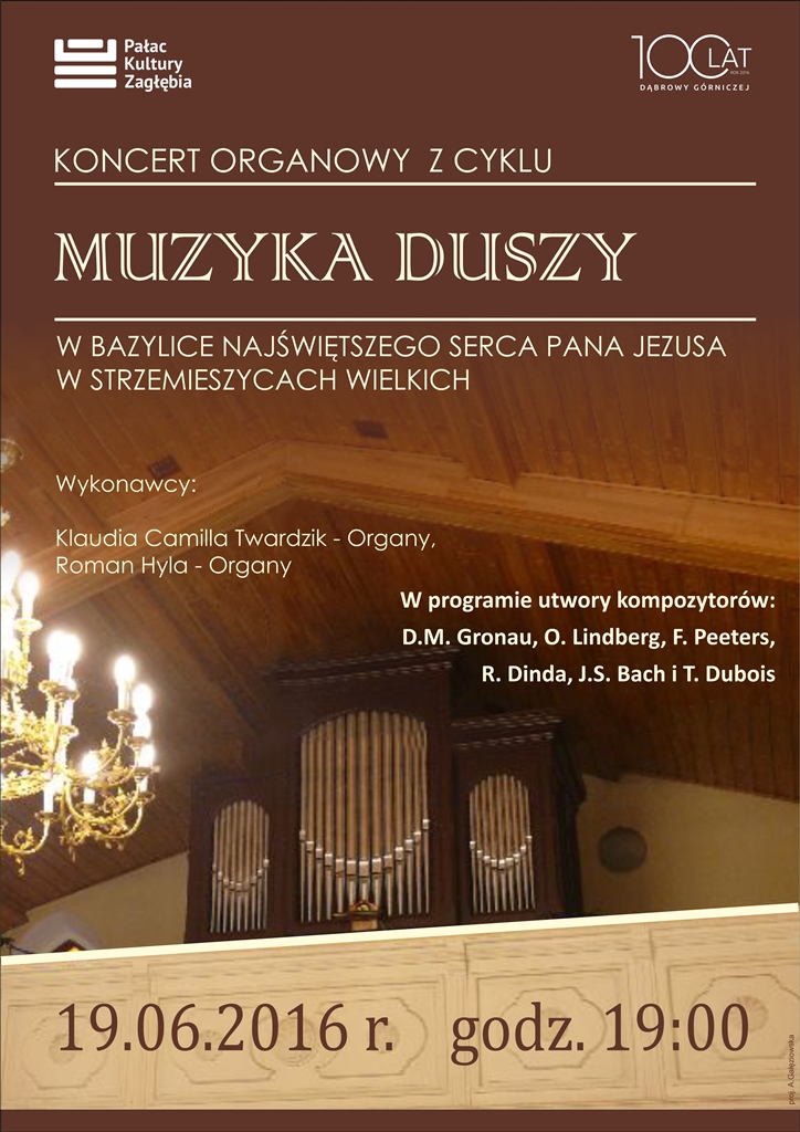 Zapraszamy na kolejny koncert organowy z cyklu "Muzyka Duszy", który tym razem odbędzie się w Bazylice Najświętszego Serca Pana Jezusa w Strzemieszycach Wielkich 19 czerwca o godzinie 19.00. Utwory kompozytorów takich jak: D. M. Gronau, O. Lidberg, F. Peeters, R. Dinda oraz znanych wszystkim J. S. Bacha i T. Dubois'a wykonają: