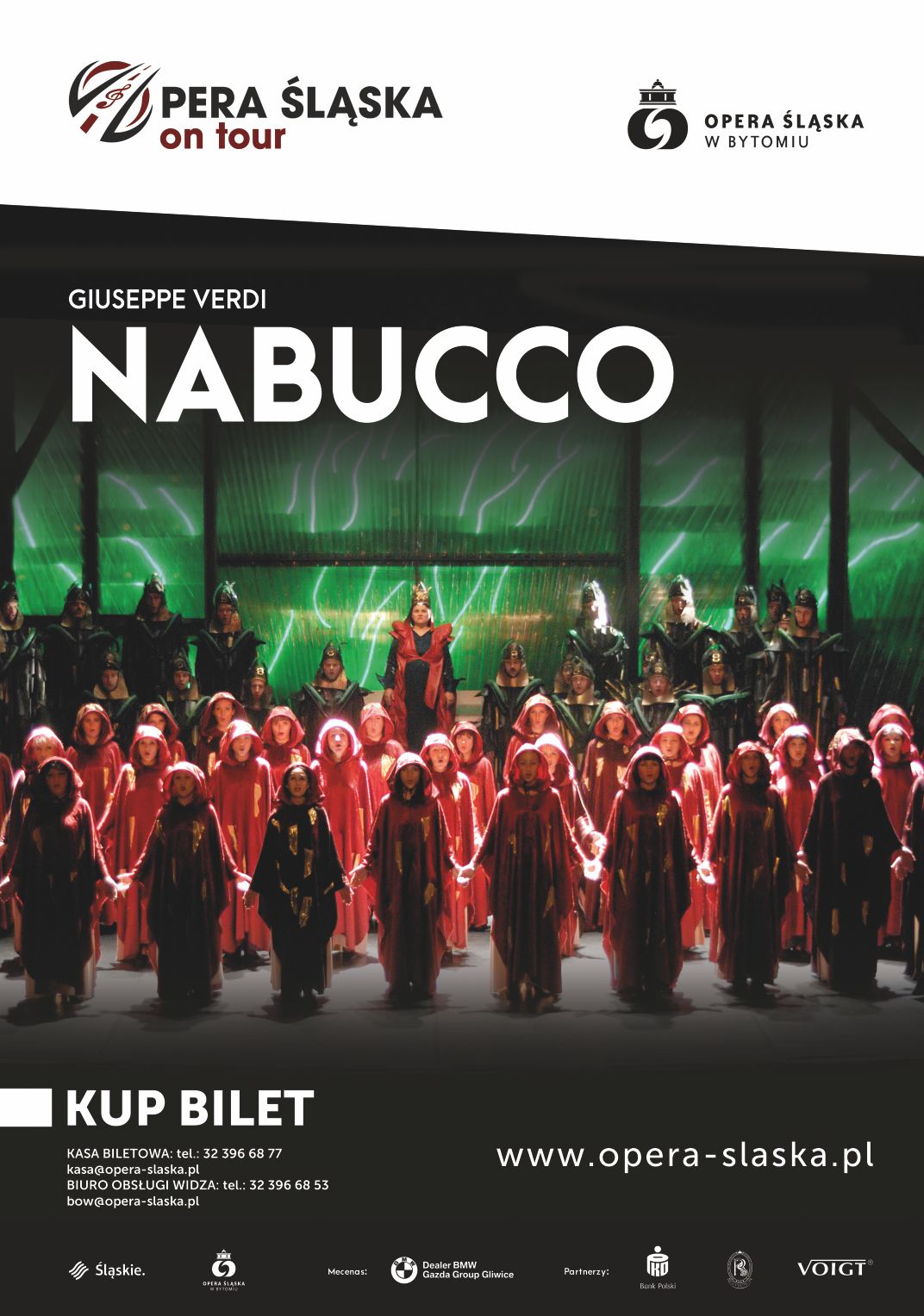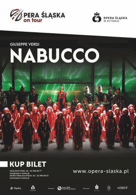 Dąbrowska publiczność będzie mogła usłyszeć przepiękną pieśń „Va pensiero”, która stała się nieoficjalnym hymnem Włoch i nawet dziś jest często bisowana. Niektórzy twierdzą, że dla tego jednego utworu nie można opuścić żadnego przedstawienia. Gromkimi brawami publiczność nagradza uwerturę oraz większość melodii - zarówno chóralnych, jak i arii czy duetów. W Operze Śląskiej spektakl ten zajmuje pozycję zaszczytną; jest jedną z wiodących oper w jej repertuarze. W Polsce zaszczyt odkrycia „Nabucca" przypadł właśnie Operze Śląskiej. To tutaj było ono wystawiane od dnia premiery z 1983 roku i przez 23 lata nie schodziło nawet na jeden sezon z afisza! Oparta na przekazach biblijnych historia dziejów narodu żydowskiego w niewoli babilońskiej, stała się jedną z najbardziej znanych i popularnych w historii gatunku. To młodzieńcze dzieło Verdiego oszałamiające rozmachem scen zbiorowych i porywających arii przyniosło mu sławę i postawiło w gronie najwybitniejszych kompozytorów w historii muzyki klasycznej. Po raz pierwszy na scenie bytomskiego teatru "Nabucco" wystawiono w 1983 r. Nowa sceniczna realizacja opery Verdiego (premiera miała miejsce w maju 2007 r.) to wyjątkowy spektakl w reżyserii Laco Adamika i obowiązkowa „lektura muzyczna" dla wszystkich miłośników sztuki operowej!