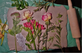 Na zajęciach ceramicznych będziemy robić ceramiczno-gipsowe obrazki z motywem florystycznym. Pierwszego dnia przez odciskanie w glinie kwiatów, traw i ziół, a następnie zalanie odcisku gipsem, powstaną nam dwa obrazki: gipsowy pozytyw i ceramiczny negatyw. Na zajęciach poznamy zasady kompozycji, a przede wszystkim poznamy nowy materiał, jakim jest gips i nauczymy się jak z nim pracować.