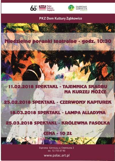 Kolejny sposób na miłe, rodzinne, weekendowe spędzanie czasu. PKZ Dom Kultury Ząbkowice zaprasza dzieci i rodziców na Niedzielne Poranki Teatralne, które odbędą się w terminach 11 i 25 lutego oraz 18 i 25 marca. Zaczynamy zawsze o godzinie 10:30. Podczas kolejnej odsłony, zobaczymy spektakle takie jak Tajemnica skarbu na kurzej nóżce, Czerwony Kapturek, Lampa Alladyna oraz Królewna Fasolka.