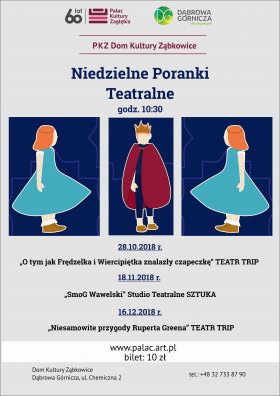 Niedzielne Poranki Teatralne to sposób na przyjemne i rodzinne spędzenie wolnego czasu. PKZ Dom Kultury Ząbkowice zaprasza wszystkie dzieci i rodziców na wyjątkowe przedstawienia, które odbędą się w terminach 28 października, 18 listopada oraz 16 grudnia, zawsze o godzinie 10:30. Czas trwania każdego spektaklu: ok. 45 min.