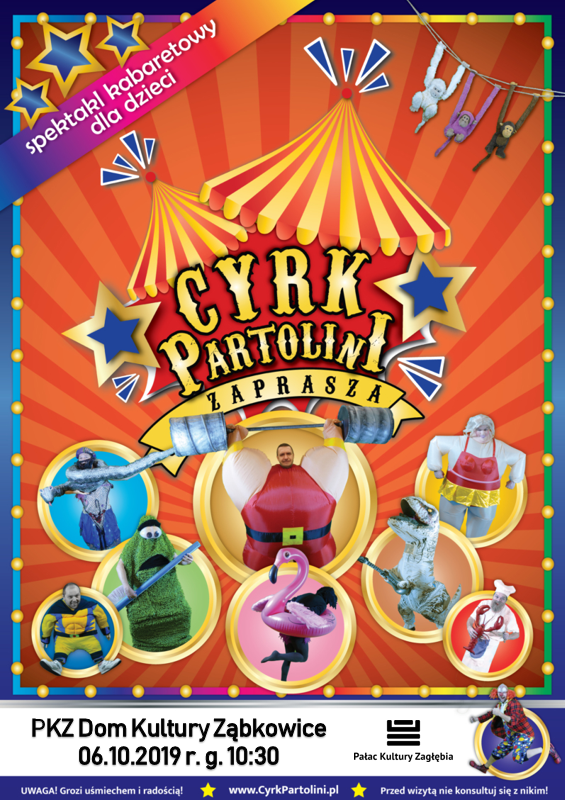 Dzieci staną przed wielkim wyzwaniem jakim jest np. utrzymanie higieny zębów czy współpraca w zespole. Wszystko po to, by pokonać wielką bakterię, która tylko czyha na wielki kąsek słodkości. Cyrk Partolini jest nie tylko jedyny w swoim rodzaju, ale także i… magiczny. Poznacie prawdziwego magika, który dzięki prawdziwej magii "spróbuje" zaczarować swój kapelusz. A co z niego wyjdzie? Tego nie wie nikt. Jest także i coś dla niejadków. Dzięki zabawnie poprowadzonej fabule, najmłodsi przekonają się co daje zjedzenie obiadu, który wcześniej ugotował dla nich szalony kucharz. Obiad - tak jak i śniadanie - to podstawa, a dzięki takim posiłkom na własne oczy zobaczymy jak szczupły atleta przeobraża się w potężnego siłacza. Obiadu również skosztują najwolniejsze zwierzęta na świecie: leniwiec i ślimak, a wtedy… (musicie to zobaczyć na żywo). Czy będą także tresowane zwierzęta? Oczywiście, że tak! Co to byłby za cyrk bez wspaniałego tańca trzech skocznych małpek. Mało? Proszę bardzo! Na własne oczy zobaczycie profesjonalny, przygotowany przez największych choreografów w kraju, taniec flamingów w stylu disco. Rodzina Partolini przygotowała dla Was ponad godzinę wspaniałej zabawy! Tutaj nie jest jak w normalnym cyrku. Tutaj nie wszystko się może udać. Tylko w Cyrku Partolini takie rzeczy są możliwe!