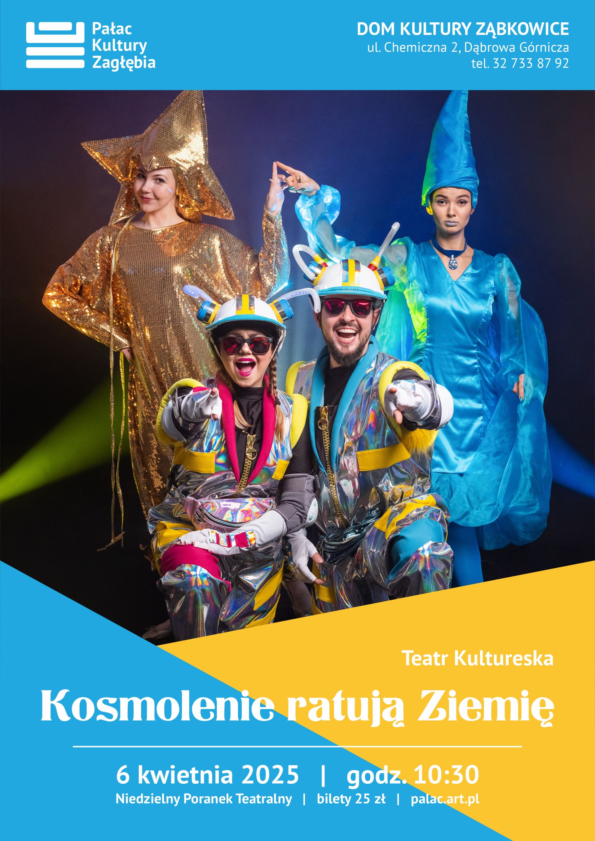 6 kwietnia o 10:30 zapraszamy do Domu Kultury Ząbkowice na kolejną odsłonę cyklu Niedzielne Poranki Teatralne, w ramach którego odbędzie się widowisko dla dzieci pt. Kosmolenie ratują Ziemię w wykonaniu Teatru Kultureska.