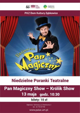 W PKZ Domu Kultury Ząbkowice na najmłodszych widzów czeka kolejny spektakl z cyklu Niedzielne Poranki Teatralne. Tym razem podczas interaktywnego spotkania pt. KRÓLIK SHOW na scenie wystąpi iluzjonista Pan Magiczny, który zabierze dzieciaki w elektryzującą podróż do świata NIESAMOWITOŚCI!