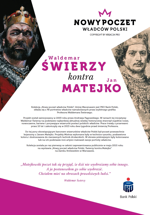 PKO Bank Polski został mecenasem pierwszego namalowanego w XXI w. pocztu władców polskich. Pomysłodawcą projektu był Andrzej Pągowski, znakomity grafik i plakacista. Oczywiście Jan Matejko był malarzem, ale akurat "Poczet" jest dziełem rysunkowym a nie malarskim. To 44 czarno-białe, narysowane ołówkiem portrety, przedstawiające postaci władców w bardzo dostojnych pozach. Dopiero po śmierci Matejki, jego uczniowie - Leonard Stroynowski i Zygmunt Papieski - stworzyli drugą wersję pocztu - malowaną, kolorową i z inaczej skadrowanymi postaciami. Właśnie te wersje - namalowane, a więc niematejkowskie - funkcjonują w powszechnej świadomości, mediach czy książkach. Powstał więc swoisty chaos i wystawa ma na celu go uporządkować. Właśnie stąd wziął się cały pomysł - mówi Andrzej Pągowski.