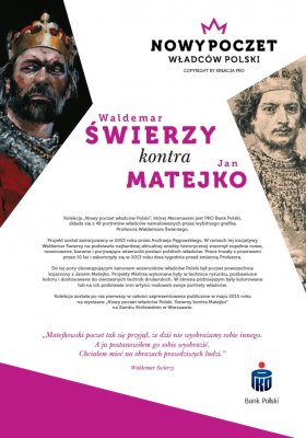 PKO Bank Polski przygotował 50 tablic w formacie 70 cm x 100 cm z wystawą Nowy poczet władców Polski. Waldemar Świerzy kontra Jan Matejko. Reprodukcje są wykonane na wzmocnionym papierze i oprawione w aluminiowe ramy zabezpieczone plastikową wkładką. Każda z 49 plansz przedstawia portret władcy Polski namalowany przez Waldemara Świerzego, a pod nim zamieszczony jest portret tego samego władcy wykonany wg rysunku Jana Matejki wraz z opisami. Pięćdziesiąta plansza zawiera informacje o wystawie - plakat otwierający wystawę.