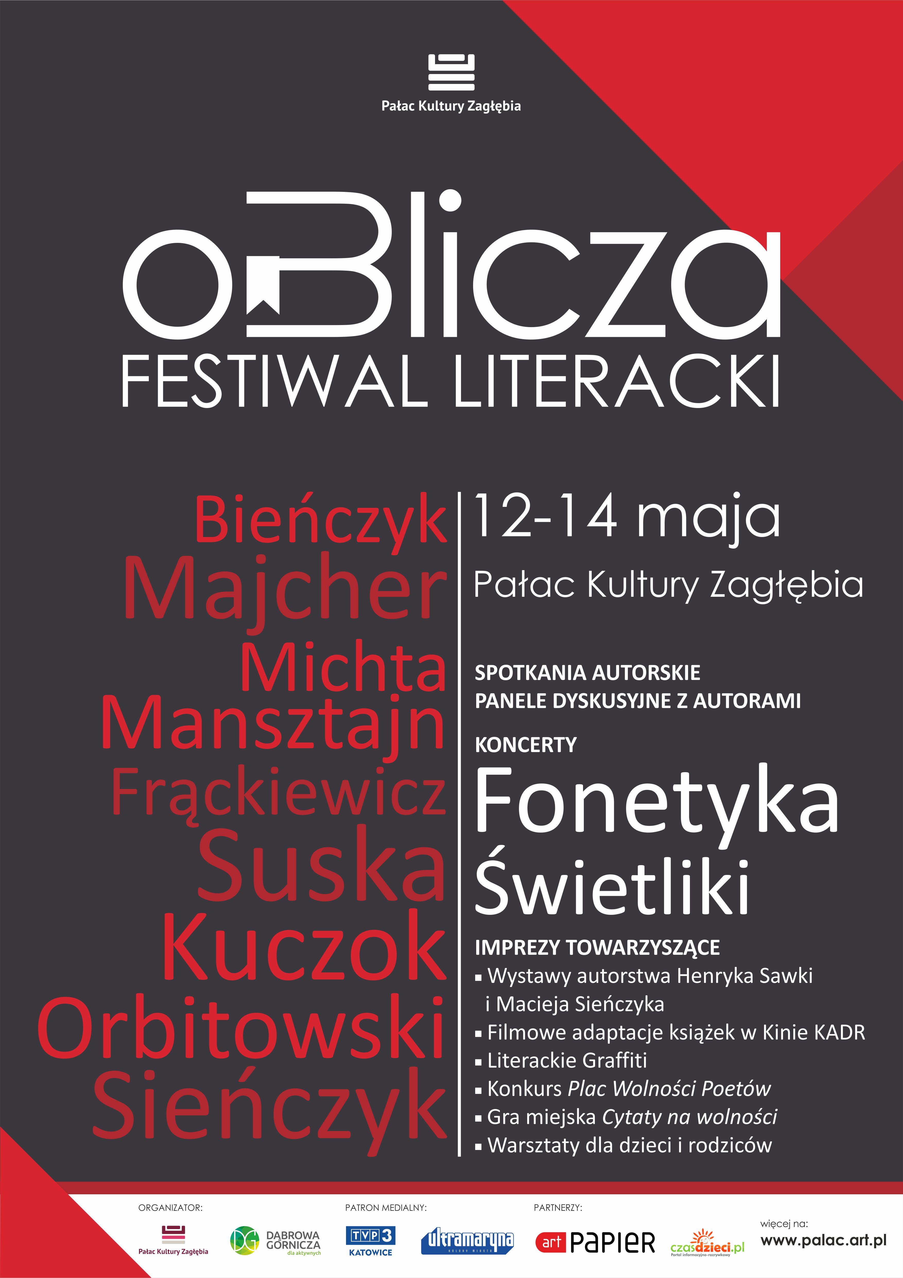 Dzieło literackie może przybrać wiele form wyrazu. Część z nich poznamy od 12 do 14 maja w Pałacu Kultury Zagłębia w Dąbrowie Górniczej podczas Festiwalu Literackiego Oblicza, który pokaże różnice i pokrewieństwo literatury z innymi dziedzinami sztuki. Postaramy się o odpowiedź na pytanie: jaka przyszłość czeka książkę, w jej klasycznym rozumieniu, w świecie pełnym mass mediów.