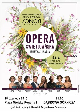 Noc Świętojańska zwana wcześniej Nocą Kupały, to święto nie tylko sięgające głęboko w obyczaje słowiańskie, ale zawierające też pierwiastki celtyckie, germańskie i indoeuropejskie. Obchodzone w okresie letniego przesilenia, było świętem jedności, połączenia ognia i wody, urodzaju, miłości i radości, pełnym magii i wróżb. Program koncertu „Opera Świętojańska” obejmuje wyjątkowe arie, duety i ansamble operowe oddające niepowtarzalny nastrój tej wyjątkowej nocy, w której spotykają się żywioły wody i ognia, a szczęście w miłości przynieść ma upragniony kwiat paproci... Wraz ze śpiewakami odwiedzamy tajemniczy moniuszkowski Straszny Dwór, zaczarowane wodne królestwo Wodnika i Rusałek z opery Dvořaka, tajemniczy hinduski ogród księżniczki Lakme, wysłuchamy romantycznej barkaroli, śpiewanej wieczorami w Wenecji, ożyje też lalka Olimpia, wprowadzając niepowtarzalny nastrój... Wieczór uzupełniają kompozycje o tematyce miłosnej z oper i operetek oraz repertuar neapolitański. Opera Świętojańska to wieczór pełen muzyki, magii i miłości.