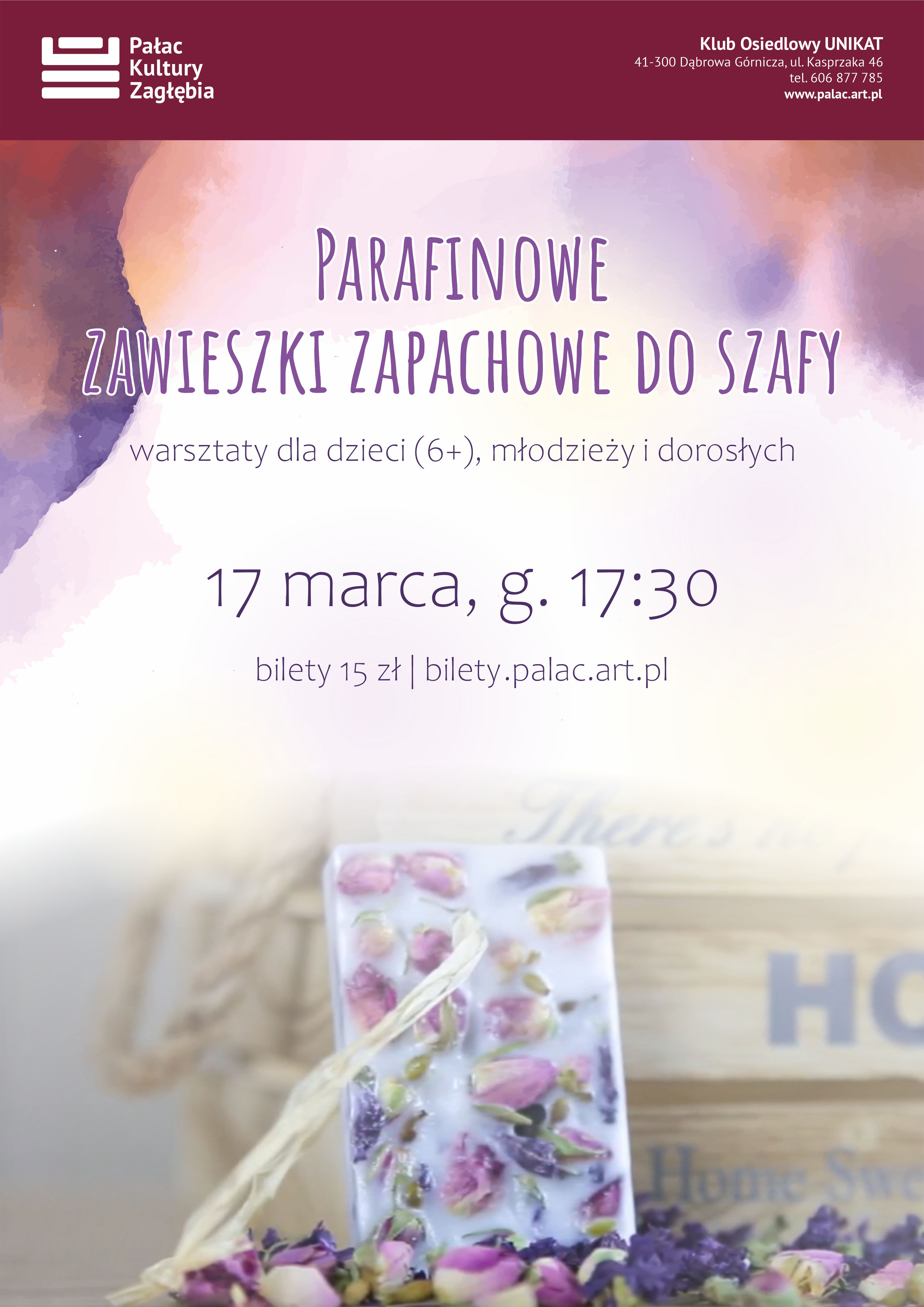 Zapachowa świeca? A może pachnące zawieszki z parafiny? W Klubie Osiedlowym Unikat 17 marca o 17:30 odbędą się warsztaty z wykorzystaniem olejków zapachowych, suszu roślinnego i parafiny. Warsztaty przeznaczone są dla dzieci (od 6 lat), młodzieży i dorosłych.