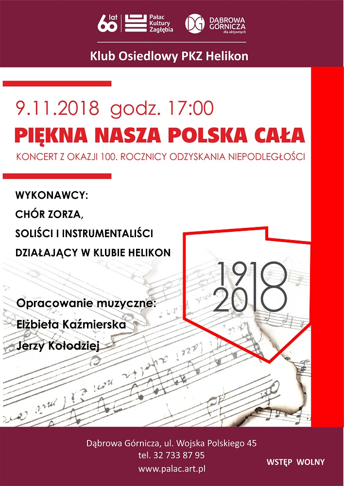 Piękna nasza Polska cała to tytuł koncertu, który odbędzie się w Klubie Osiedlowym Helikon, 9 listopada o godz. 17:00. Wydarzenie uczci 100. rocznicę odzyskania przez Polskę niepodległości. Usłyszymy utwory patriotyczne, które powstały w różnych okresach zniewolenia naszego kraju, wśród nich pieśni legionowe, powstańcze, pieśni z okresu pierwszej i drugiej wojny światowej, a także współczesne utwory patriotyczne. Koncert w wykonaniu chóru Zorza, solistów i instrumentalistów na co dzień związanych z klubem. Całość została przygotowana przez E. Kaźmierską i J. Kołodzieja.