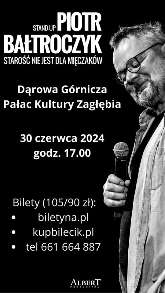 30 czerwca o 17:00 zapraszamy do Sali Teatralnej Pałacu Kultury Zagłębia, na stand-up Piotra Bałtroczyka, pt. "Starość nie jest dla mięczaków".