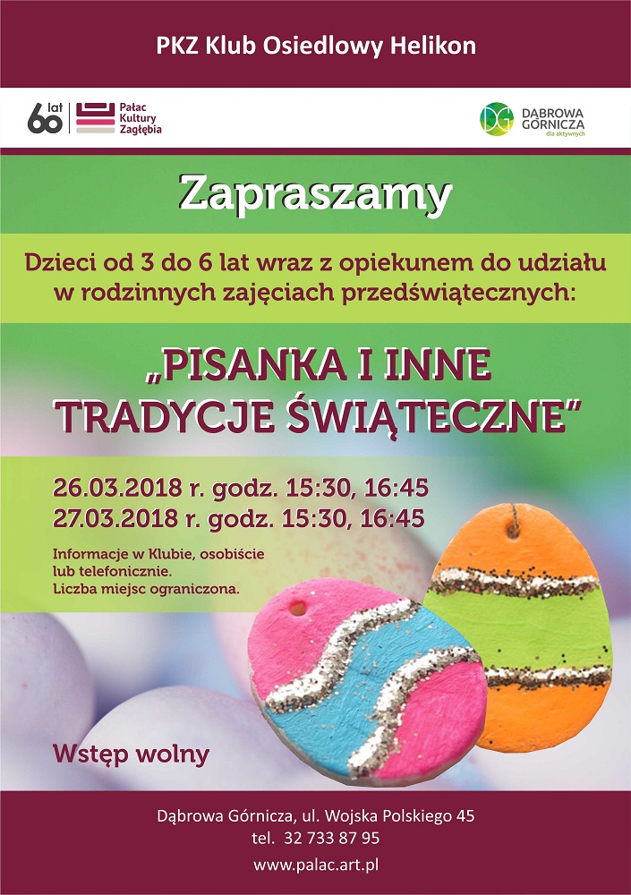 Przedświąteczne, rodzinne zajęcia dla dzieci w wieku 3-6 lat wraz z rodzicami odbędą się 26 i 27 marca (godz. 15:30 i 16:45) w Klubie Osiedlowym Helikon. Podczas warsztatów powstaną różnobarwne pisanki, a spotkanie będzie idealną okazją do przypomnienia sobie także innych zwyczajów świątecznych. Liczba miejsc ograniczona. Szczegóły i zapisy osobiście w klubie oraz pod nr tel. 32 733 87 95.