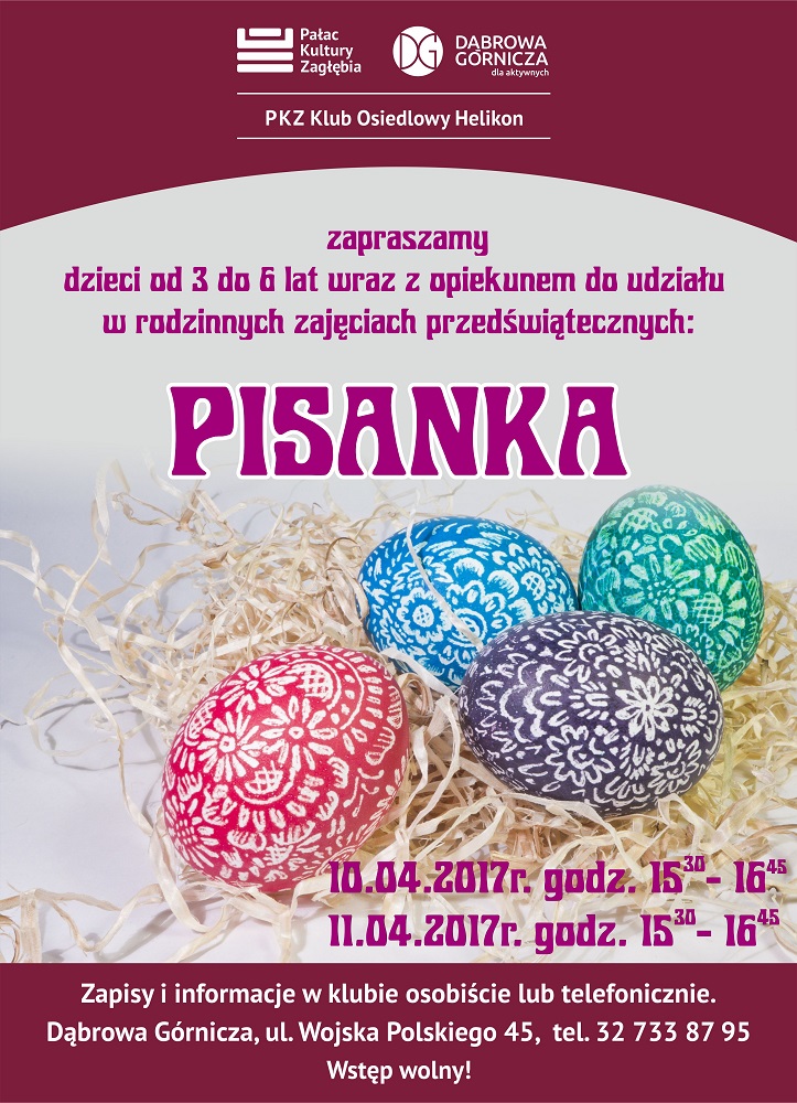 Rodzinne święta także w Klubie Osiedlowym Helikon - tutaj odbędą się wspólne wielkanocne warsztaty dla rodziców z dziećmi w wieku 3-6 lat, których tematem będą pisanki. Wstęp wolny na podstawie zapisów. Zapisy oraz szczegółowe informacje pod nr tel. 32 733 87 95. Warsztaty odbędą się 10 i 11 kwietnia, godz. 15:30 lub 16:45.