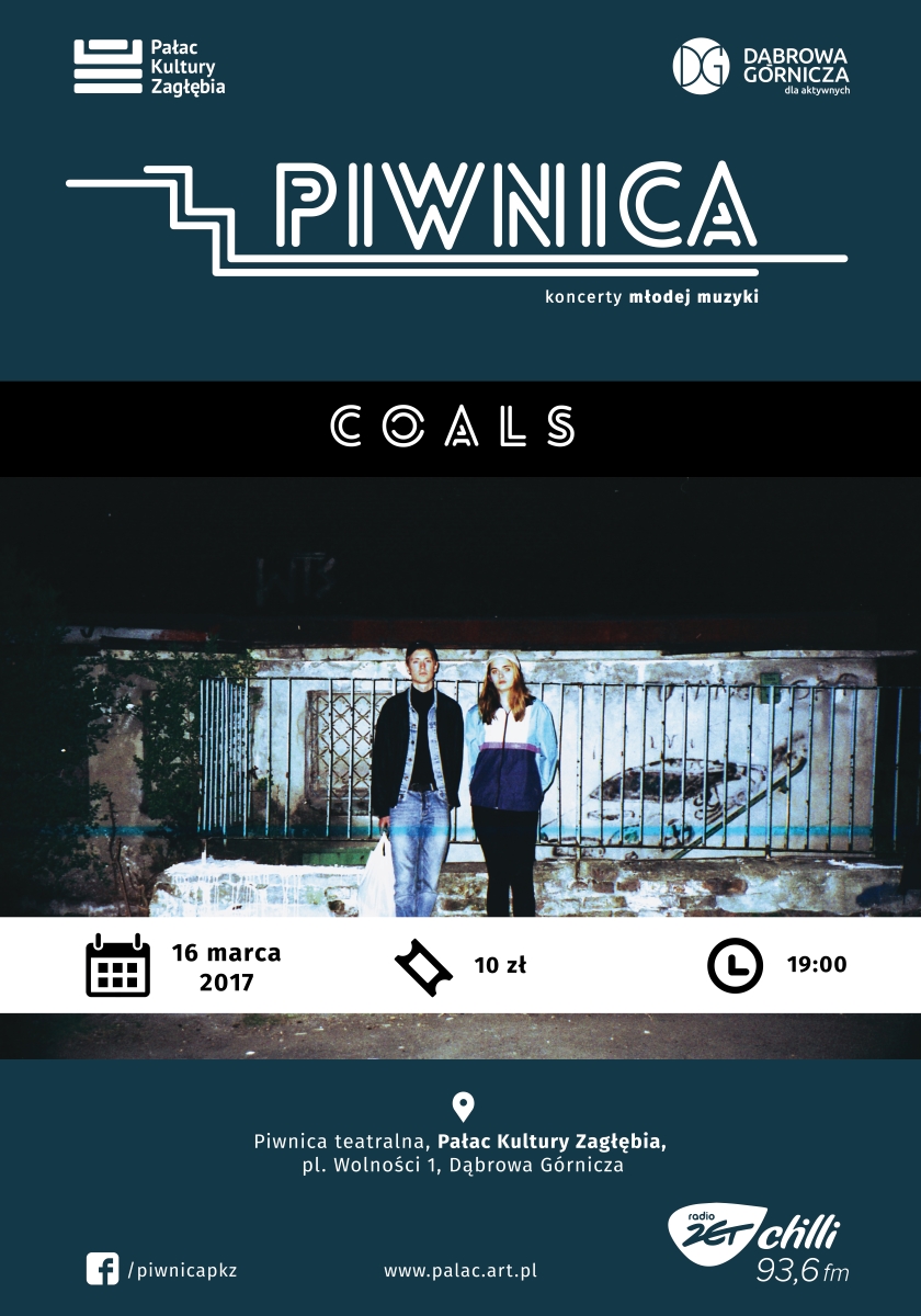 Drugim wydarzeniem cyklu PIWNICA - 16 marca o godzinie 19:00 - będzie koncert niezwykłego duetu. Osiągnęli więcej niż niejeden zespół z dorobkiem płytowym, choć ich album ukaże się dopiero w tym roku – zespół Coals! Swoją nazwą ściśle nawiązują do znanego z węgla Śląska. Według prestiżowego brytyjskiego magazynu The Quietus muzyka, którą grają to marzycielski, eteryczny pop czerpiący na równi z elektroniki i elementów folku. Ich utwór Weightless został okrzyknięty piosenką dnia, według legendarnej amerykańskiej stacji KEXP. Za sobą mają już występ na polskich i międzynarodowych festiwalach takich jak: OFF Festival, Open'er Festival czy Soundrive Festival.  W listopadzie Coals wystąpili także na festiwalu Iceland Airwaves w Reykjaviku, a także zagrali drugą sesję dla KEXP w słynnym Kex Hostel. Wśród inspiracji Kasia Kowalczyk i Łukasz Rozmysłowski wymieniają m.in. Soap&Skin, Spooky Black, Sigur Ros i Deana Blunta.
