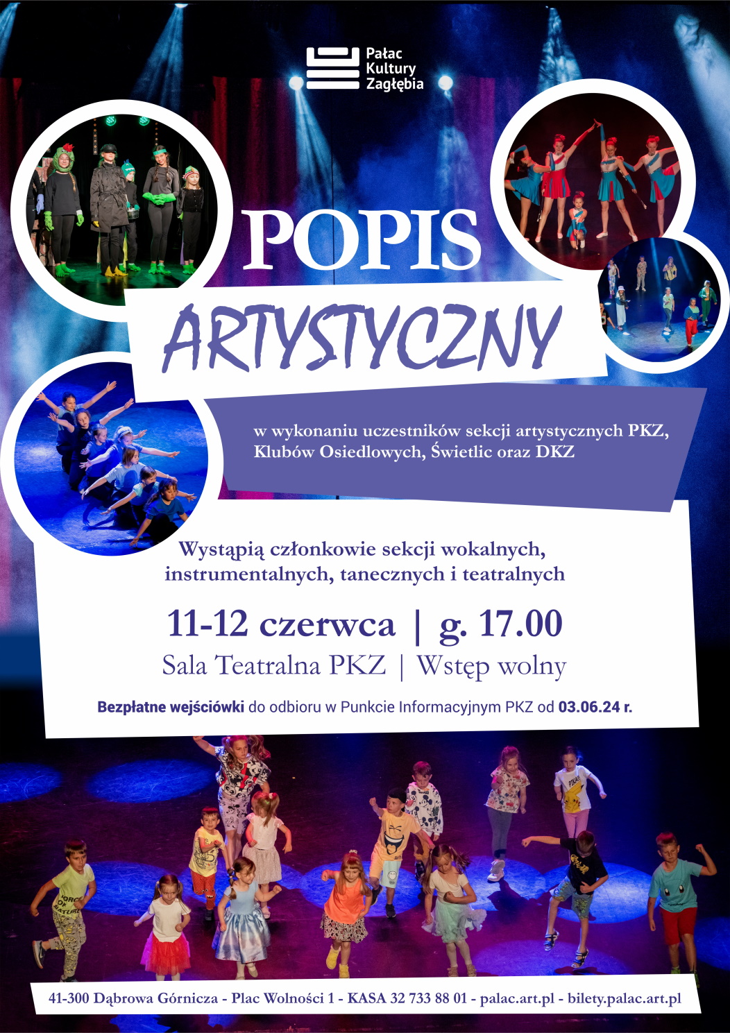 11 i 12 czerwca o godz. 17:00 zapraszamy na Popis Artystyczny będący podsumowaniem całorocznej pracy dzieci i młodzieży uczestniczącej w zajęciach Edukacji Artystycznej i Kulturalnej. Wszyscy nasi podopieczni na co dzień szlifują swoje talenty pod czujnym okiem instruktorów zarówno w Pałacu Kultury Zagłębia, Klubach Osiedlowych i Świetlicach Środowiskowych, a także PKZ Domu Kultury Ząbkowice.