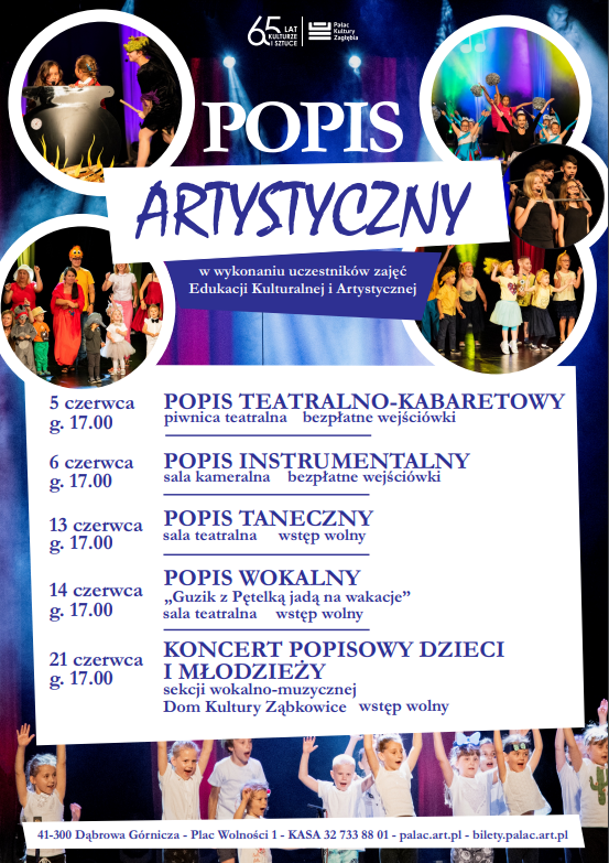 Sezon kulturalny 2022/2023 dobiega końca. To znak, że czas na POPIS! Uczestnicy zajęć Działu Edukacji Artystycznej i Kulturalnej zawładną scenami Pałacu Kultury Zagłębia, prezentując swoje umiejętności wokalne, teatralno-kabaretowe, instrumentalne i taneczne, które nabyły podczas pałacowych zajęć!