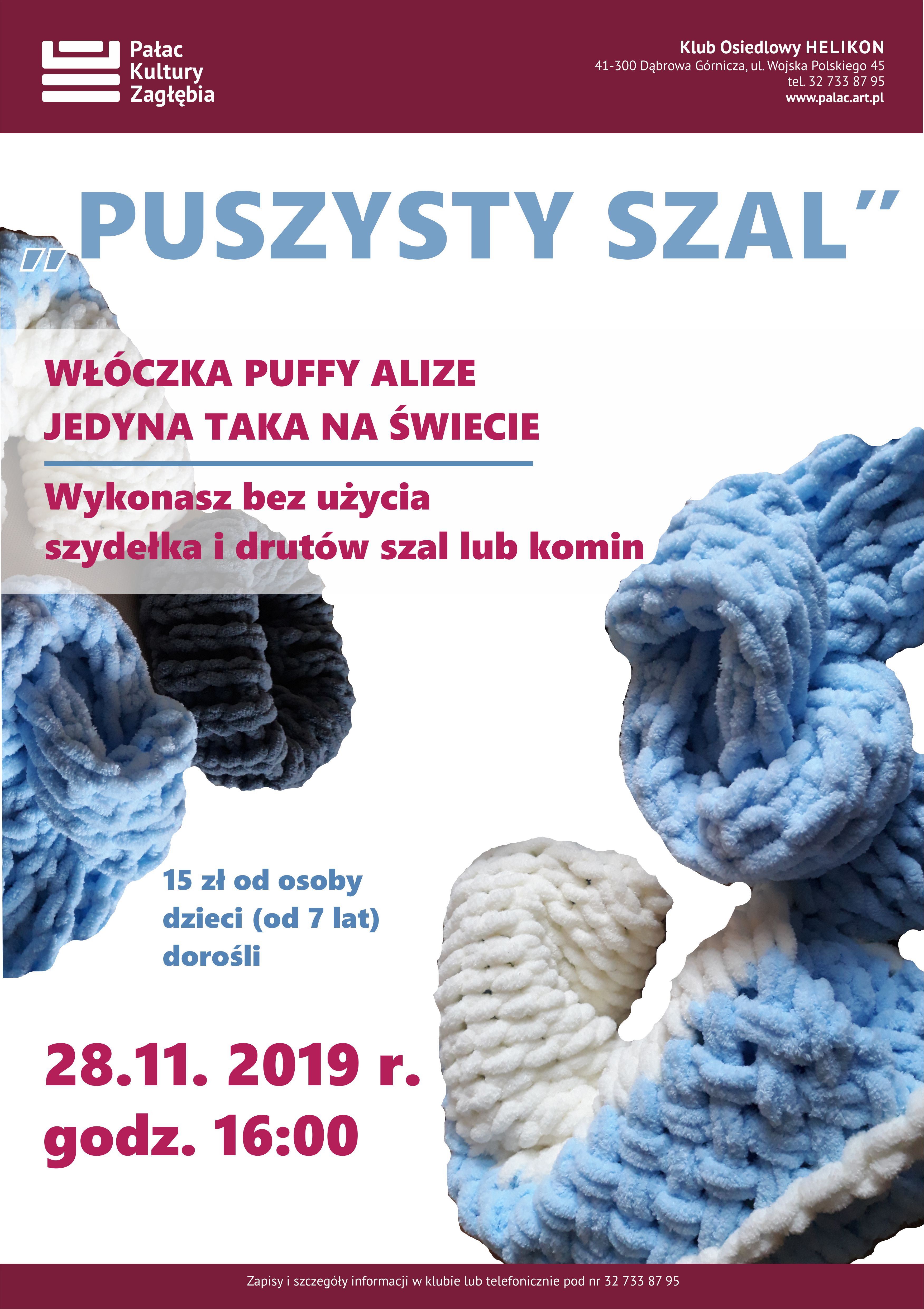 28 listopada o 16:00 w PKZ Klubie Osiedlowym Helikon odbędą się kreatywne warsztaty z włóczką Alize Puffy. Idealna propozycja dla dzieci od lat 7. oraz dorosłych, którzy chcą wykonać bez szydełka i drutów własny, ciepły, miękki szal lub komin na zimowe dni.