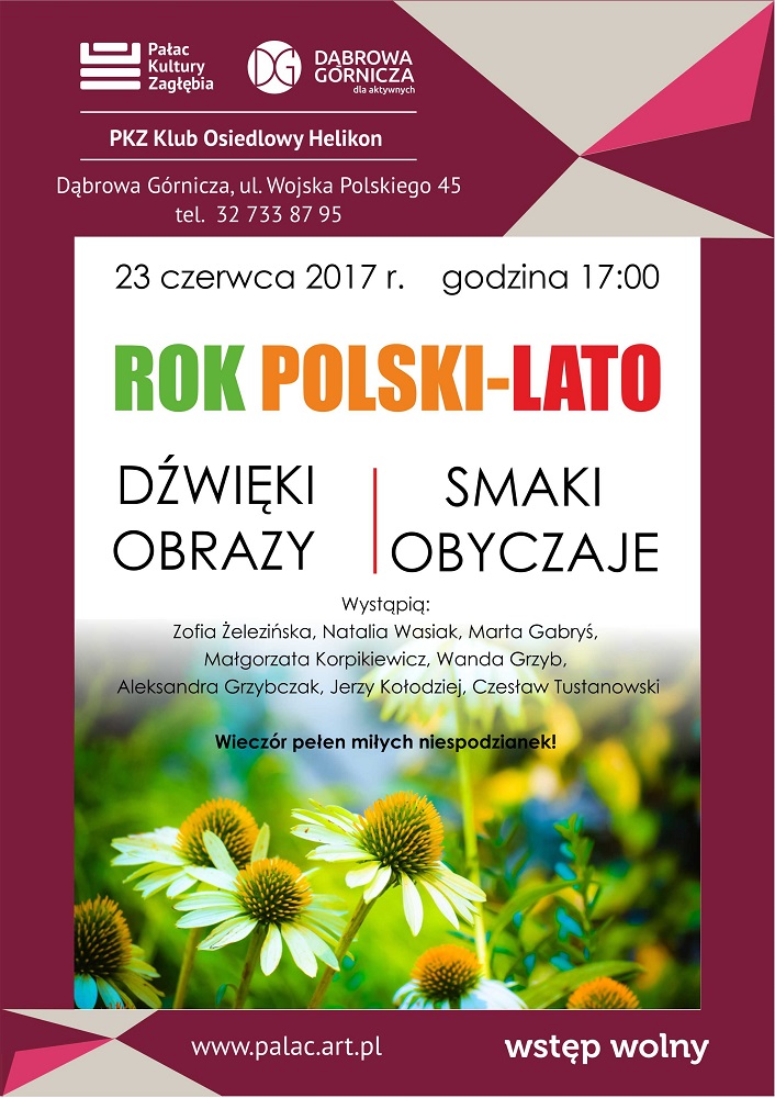 Wszystkie barwy polskiego lata utrwalone w obrzędach, poezji i prozie, na obrazach i fotografiach potwierdzą wyjątkowy urok tej pory roku podczas kolejnej edycji programu Rok polski. Nie zabraknie barwnych wspomnień z wakacyjnych wojaży oraz muzycznych akcentów. Imprezie towarzyszyć będzie wystawa obrazów Natalii Wasiak oraz wystawa fotografii Małgorzaty-Grażyny Korpikiewicz. Spotkanie odbędzie się 23 czerwca o godz. 17:00.