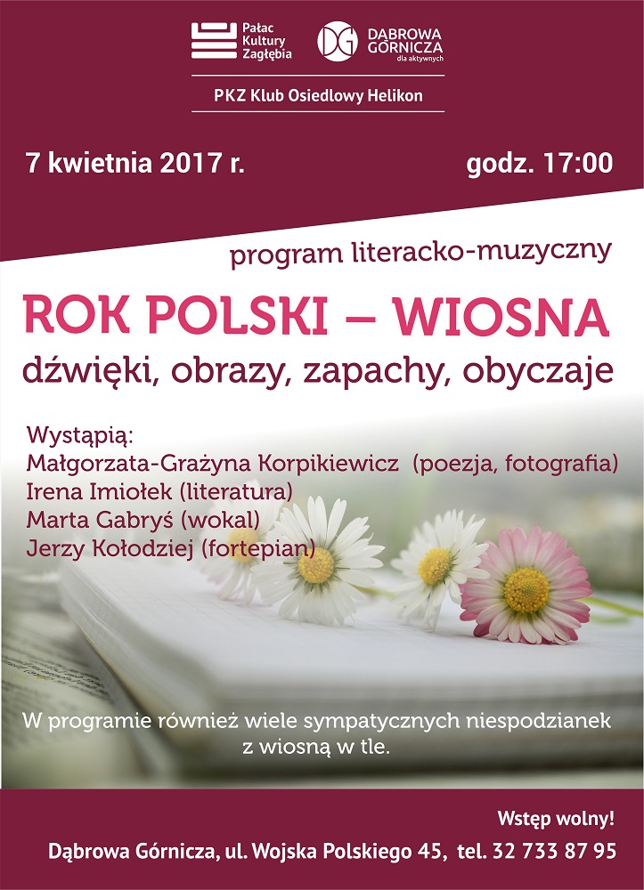 Klub Osiedlowy Helikon zaprasza do udziału w programie inaugurującym nowy cykl zatytułowany Rok Polski - dźwięki, obrazy, smaki, obyczaje. Rozpoczynamy od wspólnego odkrywania uroków wiosny, którą odnajdziemy w literaturze, malarstwie, fotografii i ludowych obrzędach. Nie zabraknie dobrej muzyki z wiosną w tle i sympatycznych niespodzianek. W programie udział wezmą Irena Imiołek, Małgorzata Grażyna Korpikiewicz, Marta Gabryś, Jerzy Kołodziej. Spotkanie odbędize się 7 kwietnia o godz. 17:00.