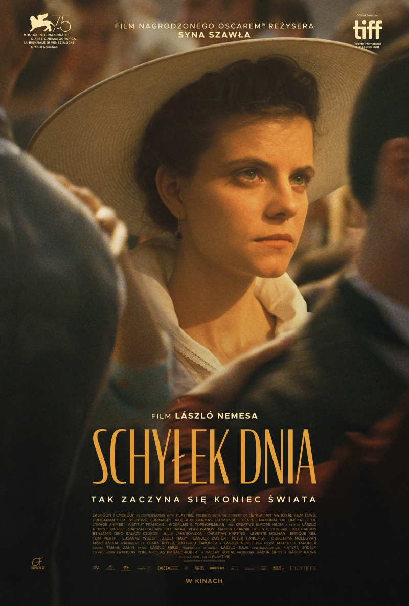 Schyłek dnia to nagrodzone na festiwalu w Wenecji najnowsze dzieło László Nemesa, zdobywcy Oscara za Syna Szawła. Skonstruowany na podobieństwo tajemniczego labiryntu film prowadzi nas przez Budapeszt u progu XX wieku, wtedy wciąż jedną z najważniejszych metropolii Europy; perłę austro-węgierskiego imperium. Przewodniczką po przekwitającym niepostrzeżenie mieście jest młodziutka Irisz, córka właścicieli sklepu z kapeluszami, którzy przed laty zginęli w pożarze. Dziewczyna szuka zaginionego brata, ale też odpowiedzi na pytania o własną tożsamość. Błądzi, zapuszcza się w zaułki i ślepe uliczki, odkrywa wnętrza eleganckich sklepów, pałaców, ale też kryjówki anarchistów i nędzne robotnicze klitki. Oto świat technologicznego triumfu i cywilizacyjnego zacofania, luksusu i niepokoju; świat, w którym o statusie świadczy twój kapelusz. Wyrafinowanie przestaje już jednak chronić przed pulsującą na obrzeżach miasta dziką energią rewolty.