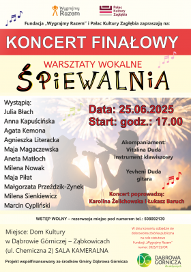 25 czerwca o g. 17:00 zapraszamy do Sali Kameralnej Domu Kultury Ząbkowice na koncert kończący kolejną edycję warsztatów wokalnych Śpiewalnia. Wstęp wolny – rezerwacja miejsc pod numerem tel. 508 092 139.