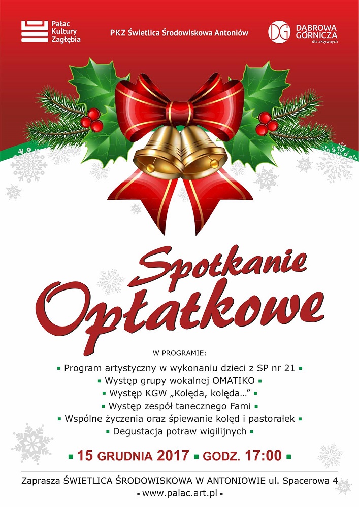 Świetlica Środowiskowa w Antoniowie zaprasza mieszkańców Antoniowa i okolic na tradycyjne spotkanie opłatkowe 15 grudnia o godz. 17:00 W programie występy artystyczne, wspólne śpiewanie kolęd i pastorałek, degustacja potraw wigilijnych. Szczegóły w świetlicy oraz pod numerem tel. 32 733 87 80.