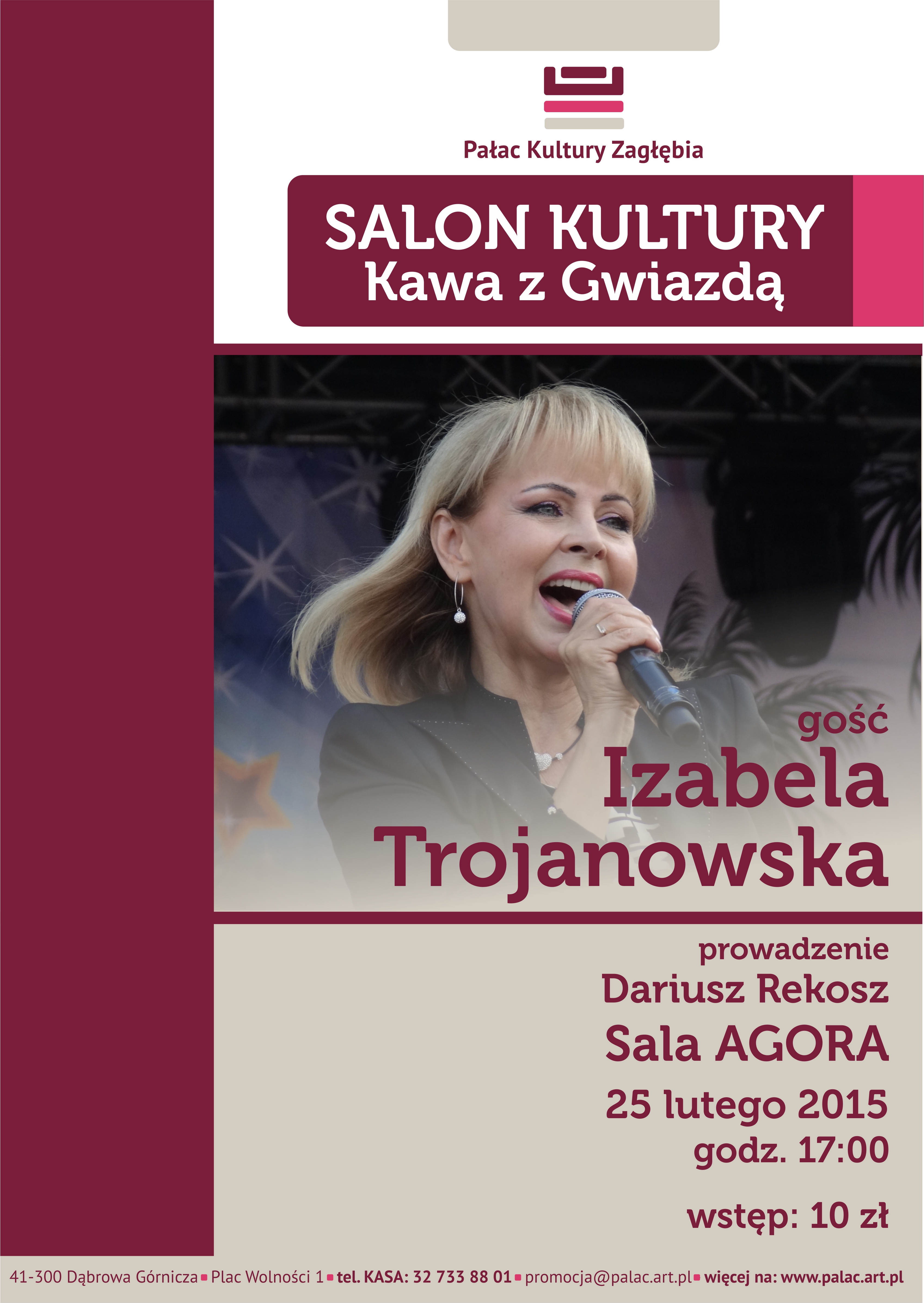 Zapraszamy na kolejne spotkanie w ramach cyklu „Kawa z Gwiazdą”. Tym razem gościem będzie znana piosenkarka i aktorka – Izabela Trojanowska. Wspólnie z Dariuszem Rekoszem – dąbrowskim pisarzem, który poprowadzi spotkanie, wspominać będzie początki swej drogi artystycznej, karierę muzyczną oraz najważniejsze role filmowe. Rozdarcie pomiędzy byciem aktorką i piosenkarką towarzyszy Izabeli Trojanowskiej od początku jej pracy artystycznej. Któż nie pamięta takich przebojów jak „Tyle samo prawd ile kłamstw”, „Wszystko czego dziś chcę”, czy „Podaj cegłę”? W pamięci widzów pozostały też jej role filmowe: Kasia w „Karierze Nikodema Dyzmy” czy Teresa Sikorzanka w „Strachach”. W roku 1997 przyjęła rolę Moniki Ross-Nawrot w serialu Klan, w którym gra do dziś i prawie codziennie możemy ją gościć w swoich domach na szklanym ekranie.