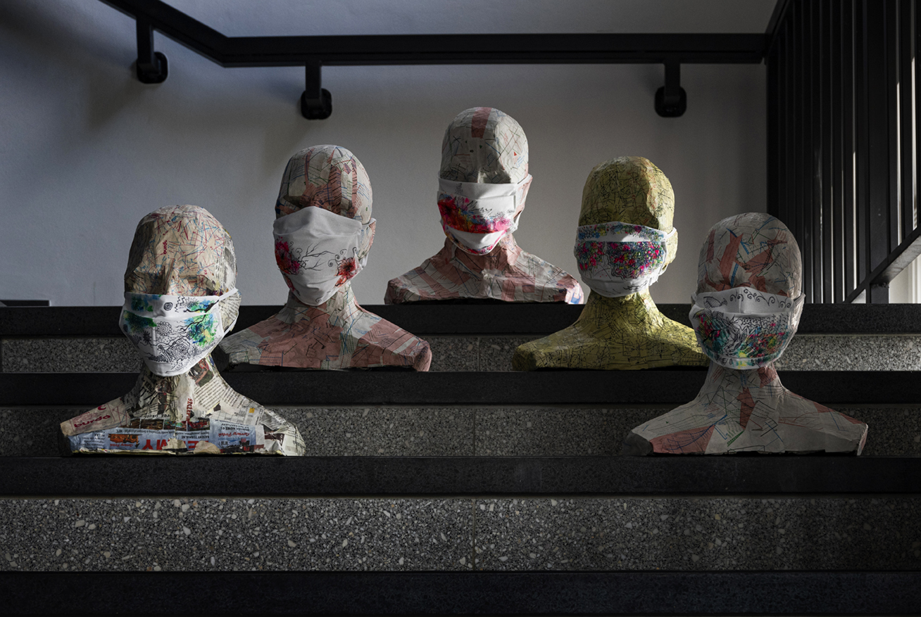 Ekspozycja Stłumiony oddech, zaparty dech powstała jako modelowy przykład zdalnej pracy zespołowej. Maja Szwedzińska, Edyta Sobieraj i Aldona Bzowska, pracowały w zaciszu swoich domów nad poszczególnymi etapami ekspozycji. Maja Szwedzińska z białej bawełny uszyła maseczki, Edyta Sobieraj opracowała koncepcję zdobień i motywów artystycznych, które następnie za pomocą farb do tkanin przeniosła na uszyte maseczki, a Aldona Bzowska wykonała za pomocą techniki paper mache popiersia. Nad całością kompozycji czuwała Kalina Bałdys i wspólnie z Mają Szwedzińską przygotowały stacjonarną ekspozycję. Można pracować razem, ale osobno i nasza wystawa jest tego przykładem - mówi Maja Szwedzińska.