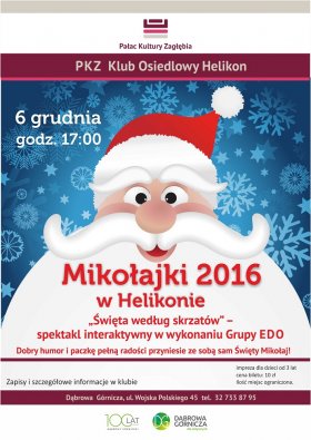 Klub Osiedlowy Helikon zaprasza na mikołajkowy spektakl interaktywny Święta według skrzatów z efektami specjalnymi, pełen barw i postaci bajkowych.