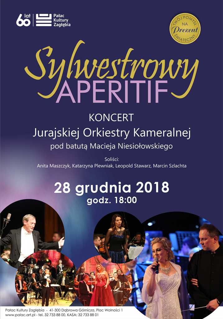 Sylwester - święto, które jednoznacznie kojarzy się z zabawą, muzyką i tańcem do białego rana. Przez wielu oczekiwane przez 365 dni, by wyzerować licznik i cieszyć się z kolejnego roku. Pałac Kultury Zagłębia proponuje koncert, który pobudzi Wasz karnawałowy apetyt i sprawi, że w tym roku Sylwester zacznie się 4 dni wcześniej! Sylwestrowy Aperitif w wykonaniu Jurajskiej Orkiestry Kameralnej pod batutą Macieja Niesiołowskiego oraz solistów Anity Maszczyk, Katarzyny Plewniak, Leopolda Stawarza oraz Marcina Szlachty 28 grudnia o godzinie 18:00!