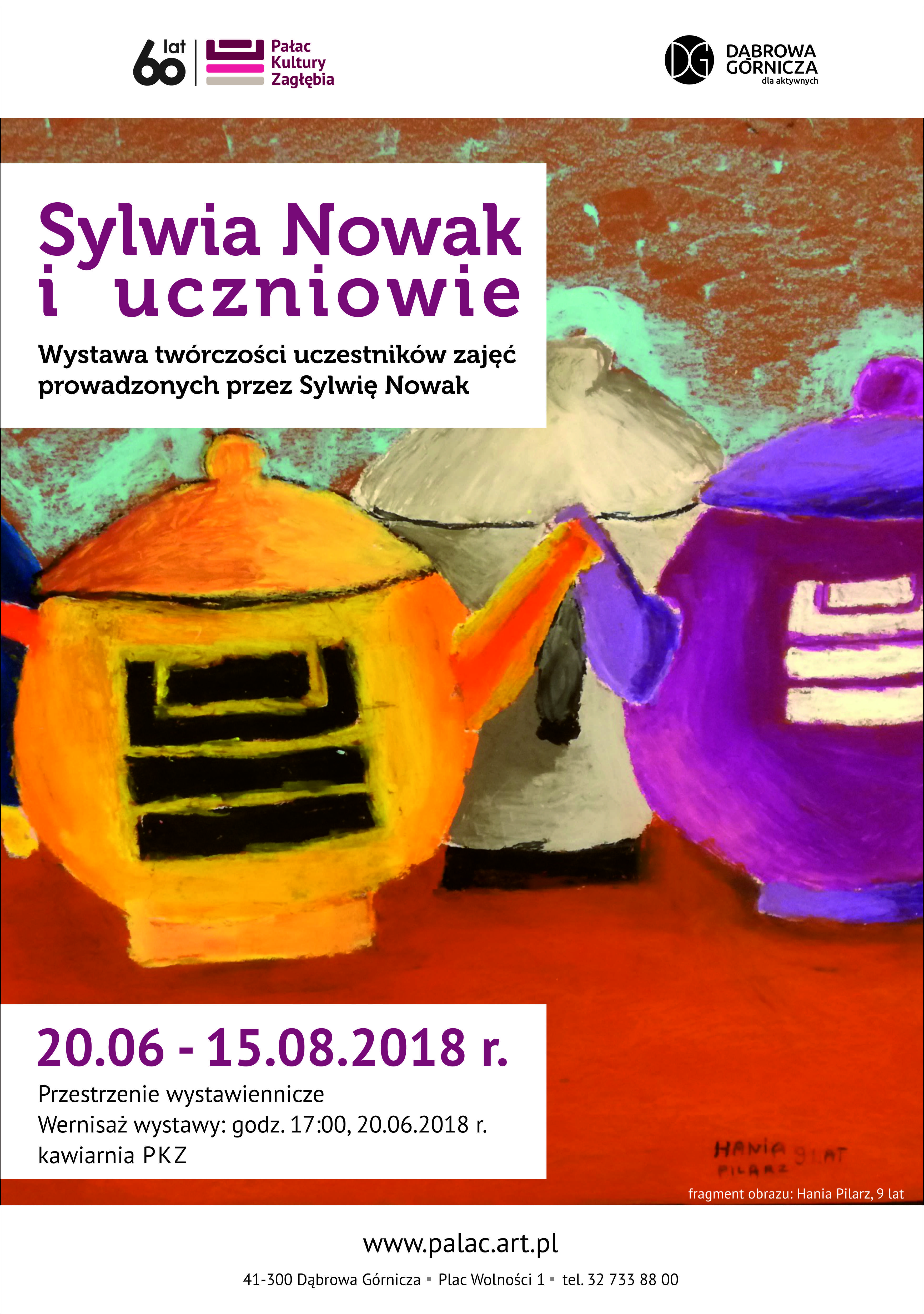 Wystawa Sylwia Nowak i uczniowie jest prezentacją twórczości uczestników zajęć plastycznych Pałacu Kultury Zagłębia - dzieci od 3. roku życia, młodzieży i osób dorosłych. Na ekspozycję składają się prace rysunkowe, malarskie, graficzne oraz ceramiczne. Te ostatnie budzą najwięcej zainteresowania wśród dorosłych. Popyt na zajęcia jest tak duży, że od kwietnia br. istnieje nowa, kolejna grupa ceramiczna. Tradycyjnie wszyscy uczestnicy prezentują prace razem z instruktorką Sylwią Nowak, która w tegorocznej odsłonie nawiązuje głównie do świata ikony. Wystawa w przeszkleniach Sali Teatralnej potrwa od 20 czerwca do 15 sierpnia.