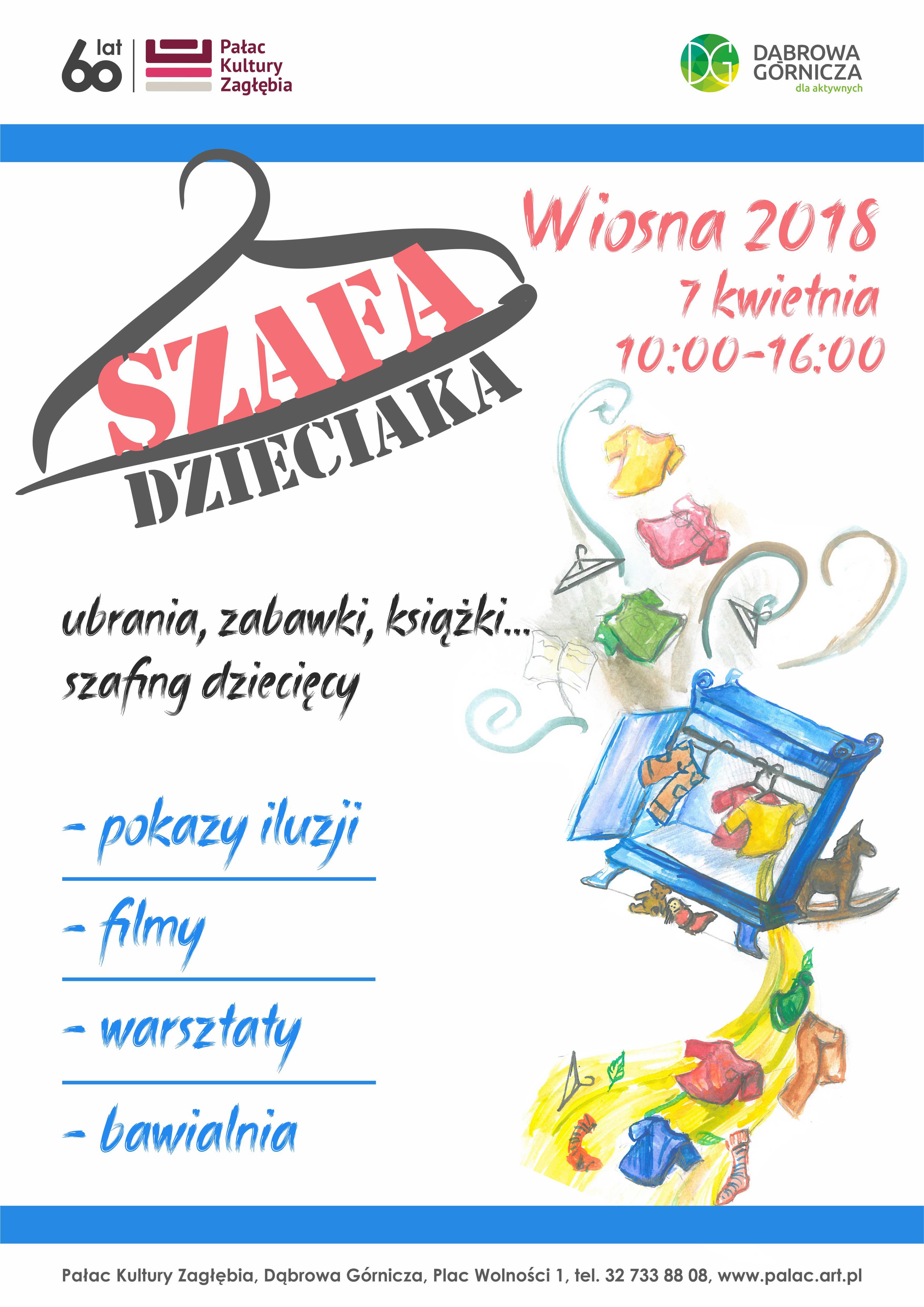 Nadciąga wiosna, a to znak, że czas na kolejną Szafę dzieciaka! Dziecięcy szafing, połączony z mnóstwem atrakcji dla najmłodszych, odbędzie się już po raz siódmy - 7 kwietnia w godz. 10:00-16:00, w Pałacu Kultury Zagłębia. Szafing, czyli wymiana lub sprzedaż dziecięcych rzeczy to doskonały sposób, aby w ekologiczny i ekonomiczny sposób pozbyć się niepotrzebnych ubrań, butów, książek, zabawek, fotelików i innych dziecięcych różności oraz skompletować dziecku wyprawkę na letni sezon. Łącznie podczas Szafy dzieciaka będzie zorganizowanych ok. 80 stoisk szafingowych. Całość urozmaicą przyjemności dla małych ludzi - seanse w kinie KADR, pokazy iluzji, zajęcia teatralne, zabawy, warsztaty artystyczne.