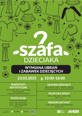 Szafing, czyli wymiana lub sprzedaż dziecięcych rzeczy to doskonały sposób, aby w ekologiczny i ekonomiczny sposób pozbyć się niepotrzebnych ubrań, butów, książek, zabawek itp. i skompletować dziecku wyprawkę na sezon wiosenno-letni. Szafingowi będą towarzyszyć atrakcje dla najmłodszych: warsztaty artystyczne, filmy dla dzieci w Kinie KADR, zajęcia Sensoplastyki® oraz Teatrzyk Kukiełkowy.