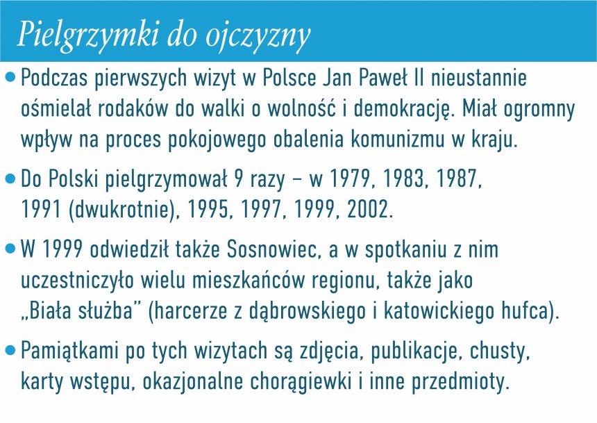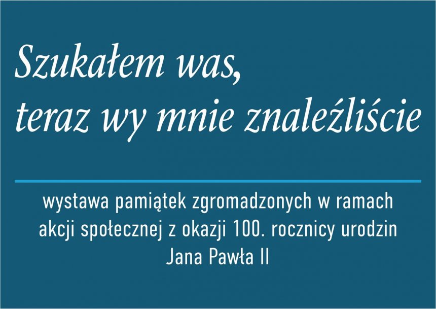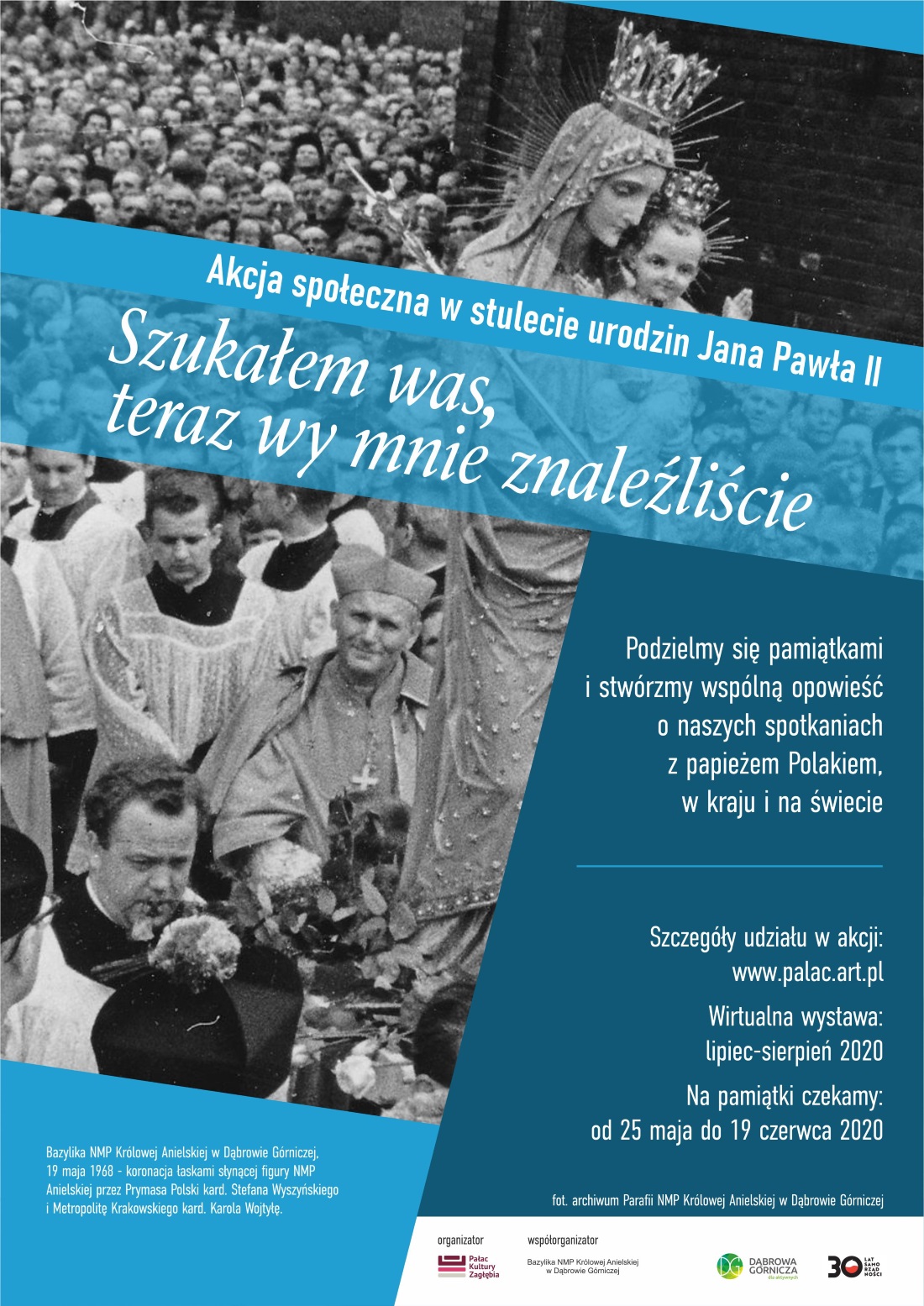 18 maja 2020 roku minęła setna rocznica urodzin papieża Polaka, jednej z najważniejszych postaci w dziejach współczesnej Polski, Europy i świata. Choć odszedł od nas piętnaście lat temu, pamięć o nim w wielu pozostaje żywa, czego dowodem jest zaangażowanie mieszkańców regionu w akcję społeczną zbierania pamiątek po Janie Pawle II pn. Szukałem was, teraz wy mnie znaleźliście. Przyszła pora, by pokazać efekt wspólnej pracy, dlatego od 1 lipca w „Galerii za szybą” w Holu Głównym Pałacu Kultury Zagłębia będzie można podziwiać wystawę pamiątek i publikacji, tworzących zbiorowy portret wybitnej postaci Karola Wojtyły. Wystawa potrwa do końca sierpnia 2020 r.