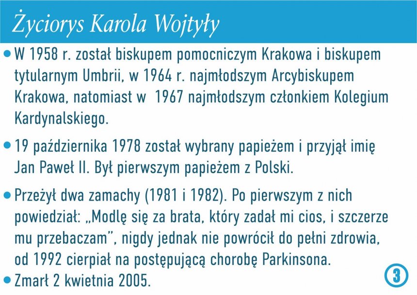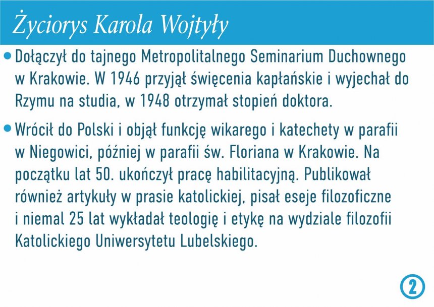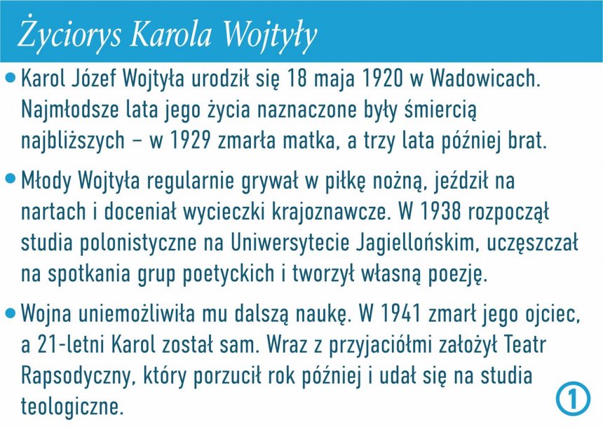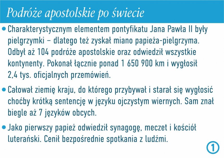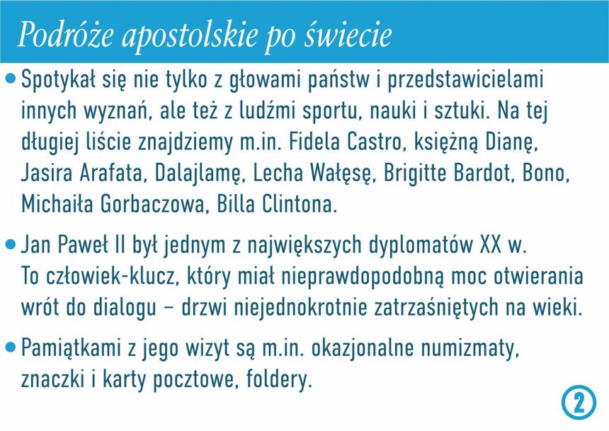 Niebywała, trudna, momentami dramatyczna, a jednak tak klarowna droga życia Jana Pawła II ukazuje siłę jego nieprzeciętnej charyzmy, budowanej nie w oparciu o atrybuty władzy, jako najwyższego przedstawiciela Kościoła Katolickiego na świecie, ale na otwartości na wielorodność kulturową i nieustający dialog. W trakcie niemal sześciu dekad posługi kapłańskiej Karol Wojtyła odwiedzał ludzi na całym świecie, wierząc w szczególną moc sprawczą osobistych spotkań. Ponad sto pielgrzymek w trakcie 27 lat pontyfikatu, w tym 9 wizyt w kraju ojczystym to spotkania z osobami w każdym wieku, każdej rasy, wielu religii, pozycji społecznej, zdrowych i chorych. To również niebywałe rozmowy w głowami państw, decydującymi o losie swoich narodów, z najwyższymi hierarchami cerkwi prawosławnej, przedstawicielami religii judaistycznej i islamu.