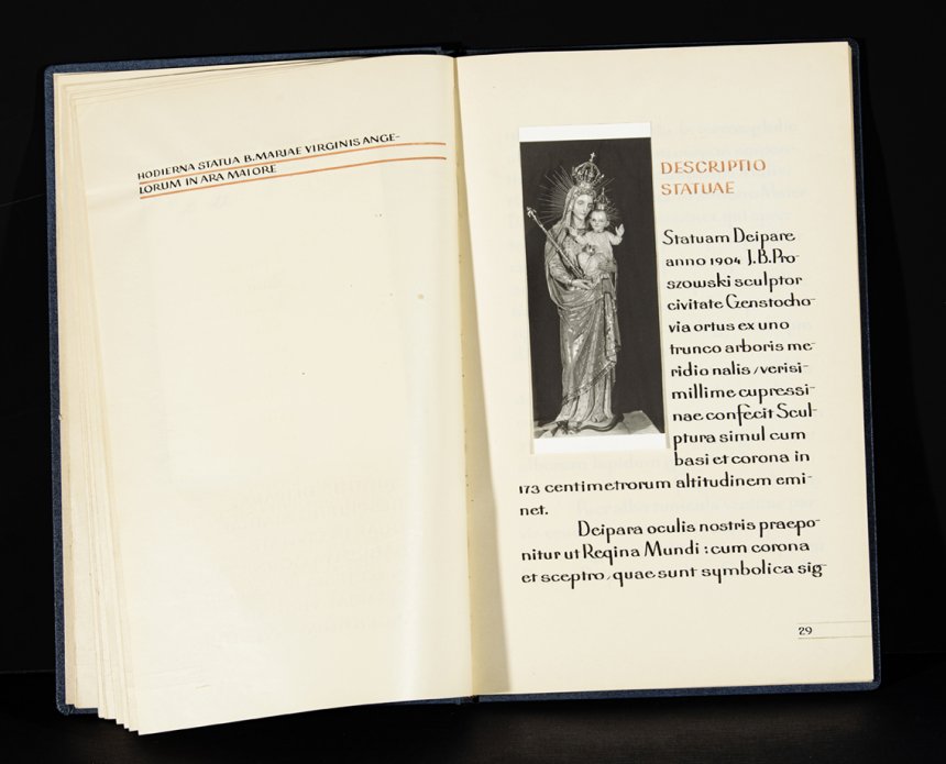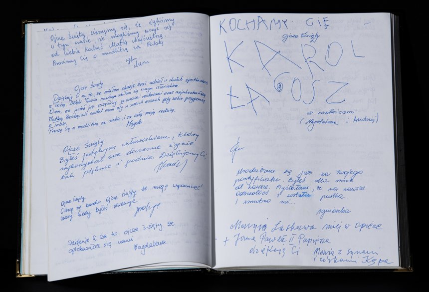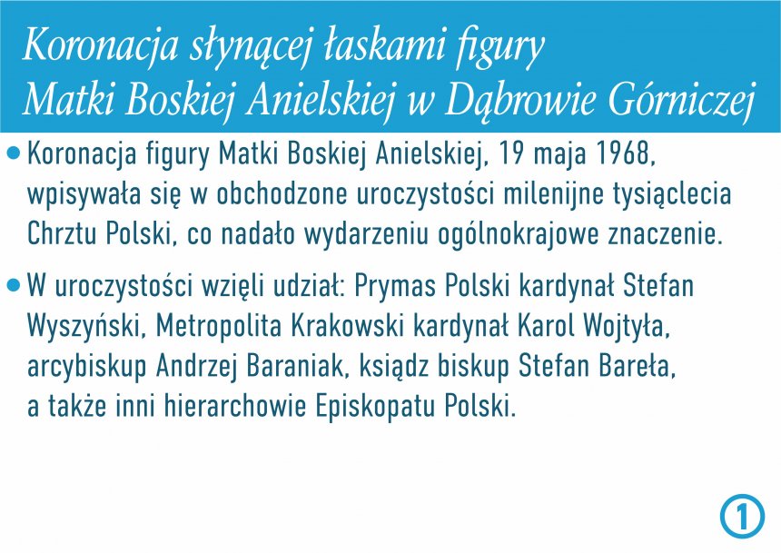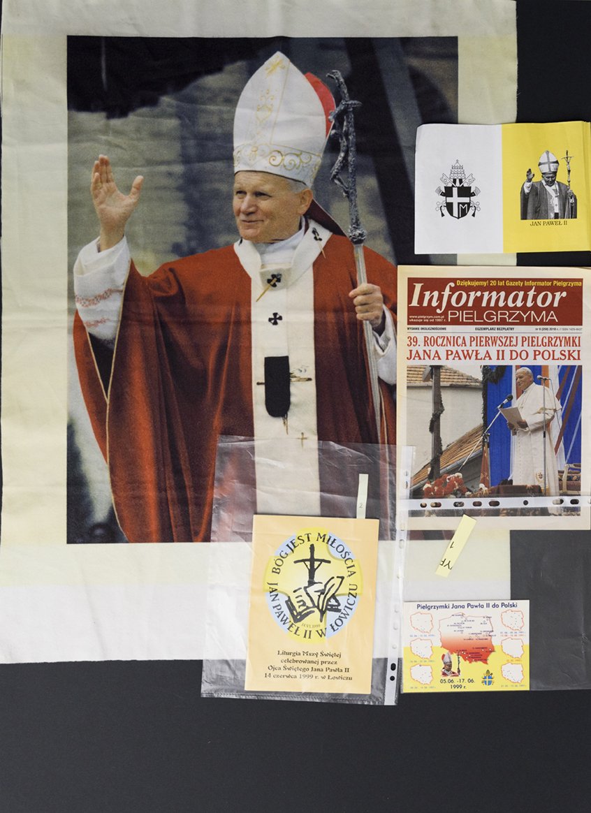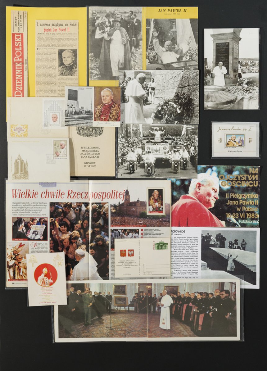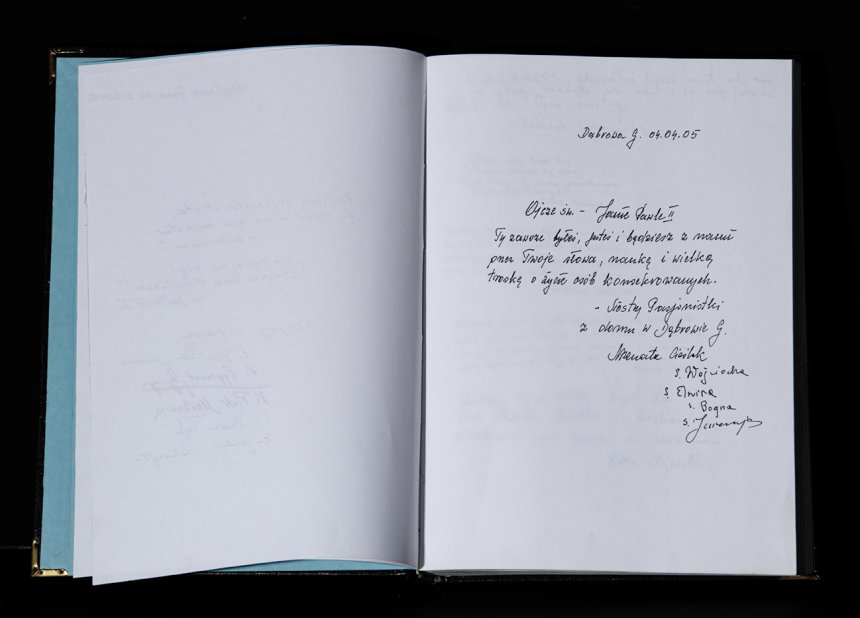 Prezentujemy również fotografie ze zbiorów Bazyliki NMP Królowej Anielskiej w Dąbrowie Górniczej, relacjonujące wizytę prymasa Stefana Wyszyńskiego i kardynała metropolity krakowskiego Karola Wojtyły podczas uroczystości koronacji cudownej figury Najświętszej Marii Panny w 1968 roku. Bezcenną pamiątkę stanowi oryginalna księga składana w Watykanie w ramach procedury uzyskania zgody na koronację figury pt.: Preces pro Decreto Coronationis Thaumaturgae Statuae Beatae Mariae Virginis Angelorum (…), ręcznie spisana w języku łacińskim, zawierająca autografy prymasa Wyszyńskiego i kardynała Wojtyły, a także księga kondolencyjna parafii, do której swoje słowa pożegnania wpisywali mieszkańcy Dąbrowy Górniczej po śmierci papieża.
