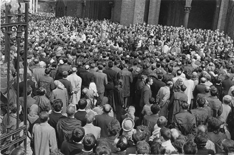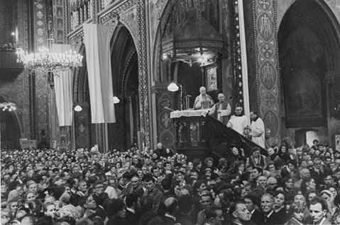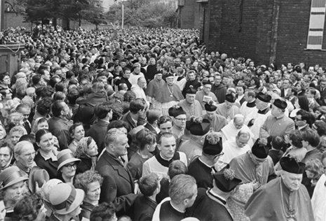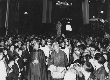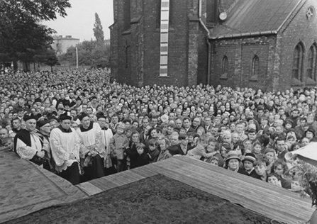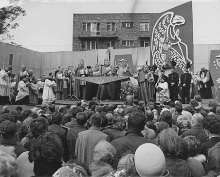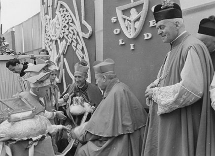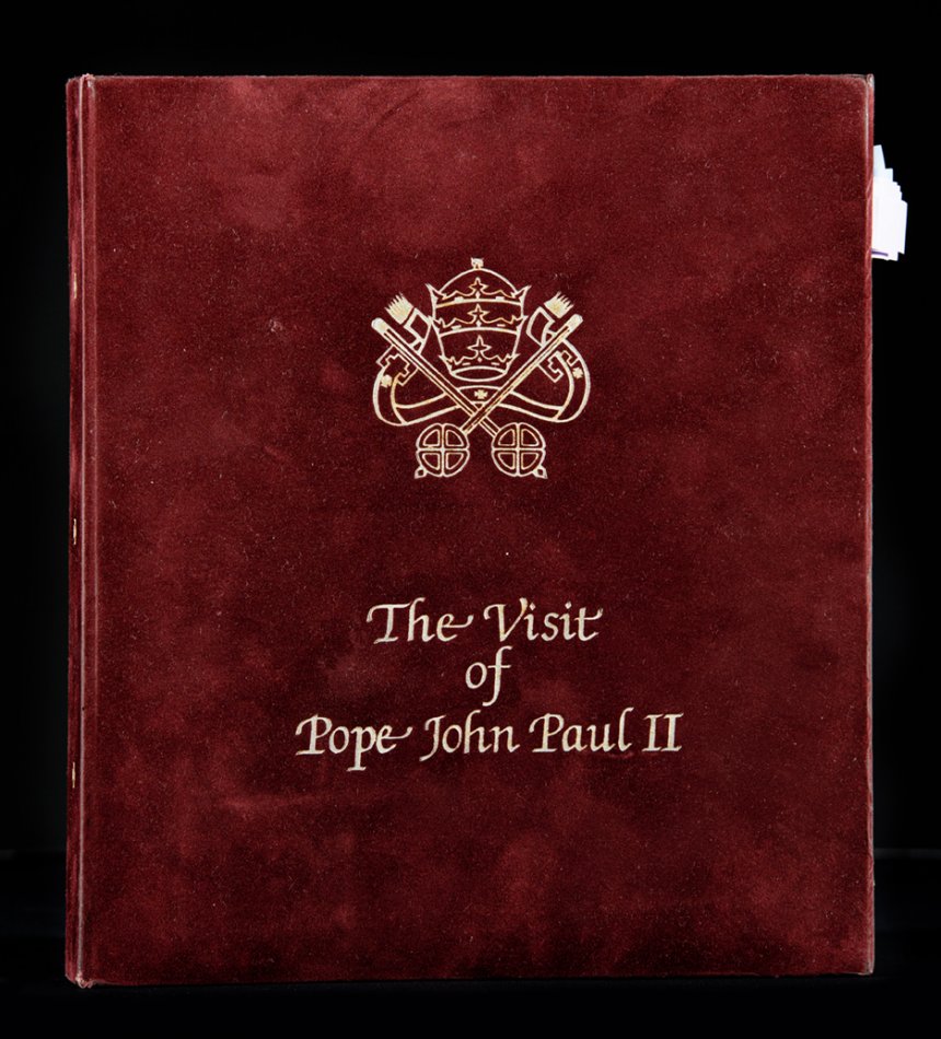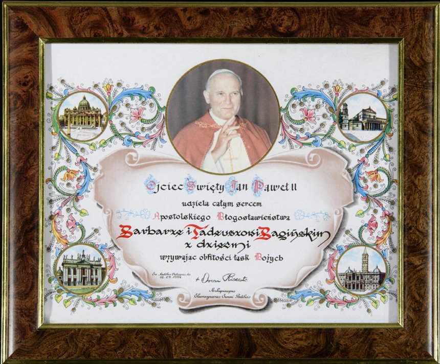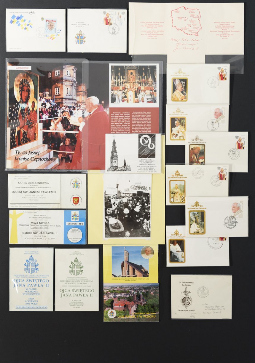 Prezentujemy również fotografie ze zbiorów Bazyliki NMP Królowej Anielskiej w Dąbrowie Górniczej, relacjonujące wizytę prymasa Stefana Wyszyńskiego i kardynała metropolity krakowskiego Karola Wojtyły podczas uroczystości koronacji cudownej figury Najświętszej Marii Panny w 1968 roku. Bezcenną pamiątkę stanowi oryginalna księga składana w Watykanie w ramach procedury uzyskania zgody na koronację figury pt.: Preces pro Decreto Coronationis Thaumaturgae Statuae Beatae Mariae Virginis Angelorum (…), ręcznie spisana w języku łacińskim, zawierająca autografy prymasa Wyszyńskiego i kardynała Wojtyły, a także księga kondolencyjna parafii, do której swoje słowa pożegnania wpisywali mieszkańcy Dąbrowy Górniczej po śmierci papieża.