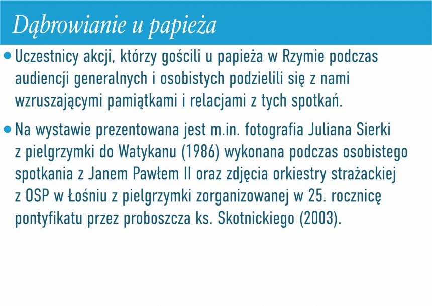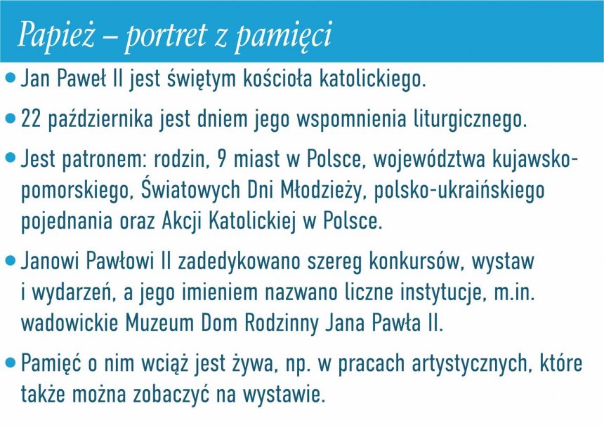 Pamiątki udostępnili uczestnicy wyjątkowych spotkań z Janem Pawłem II oraz kolekcjonerzy – łącznie to ponad tysiąc eksponatów! Wystawa prezentuje część zbiorów, ale zawiera te najbardziej osobiste: fotografie z audiencji i uczestnictwa w pielgrzymkach, ekwipunek pielgrzymów, znaczki, numizmaty i pocztówki upamiętniające wizyty papieża na całym świecie, dewocjonalia, rękodzieło, wycinki prasowe.