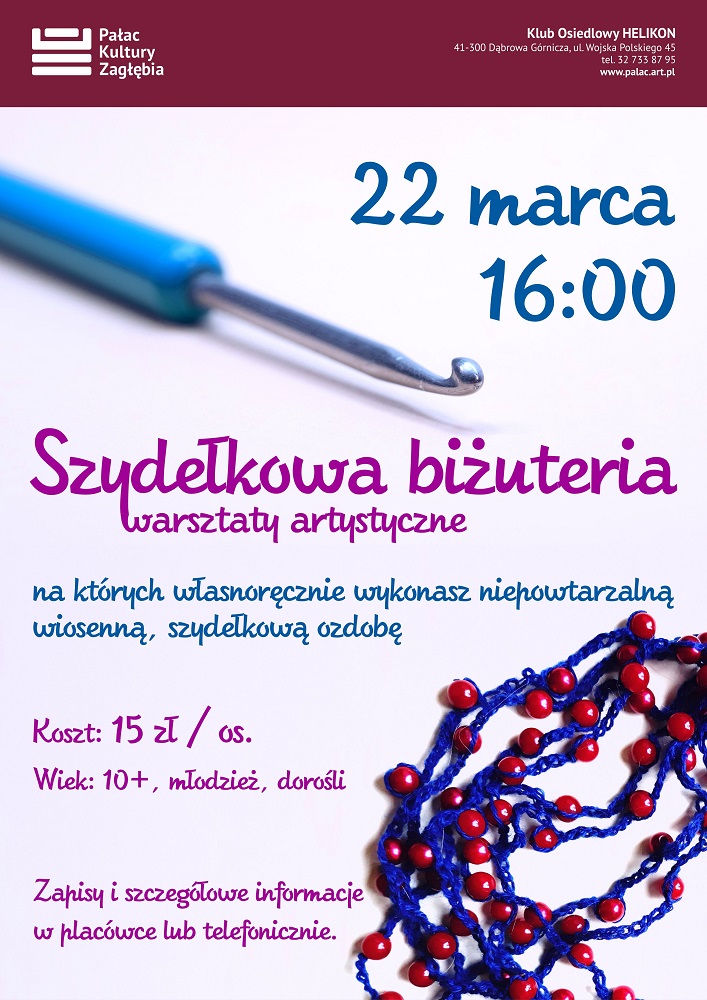 Nadchodzi wiosna, a z nią czas na zmiany, także zmianę biżuterii. Wszystkich chętnych do wykonania nowych błyskotek zapraszamy do Klubu Osiedlowego Helikon na warsztaty artystyczne Szydełkowa biżuteria, które odbędą się 22 marca (piątek) o godz. 16:00. To świetna okazja nie tylko do sworzenia własnoręcznie wykonanej biżuterii za pomocą szydełka, ale też spotkania w miłej atmosferze.