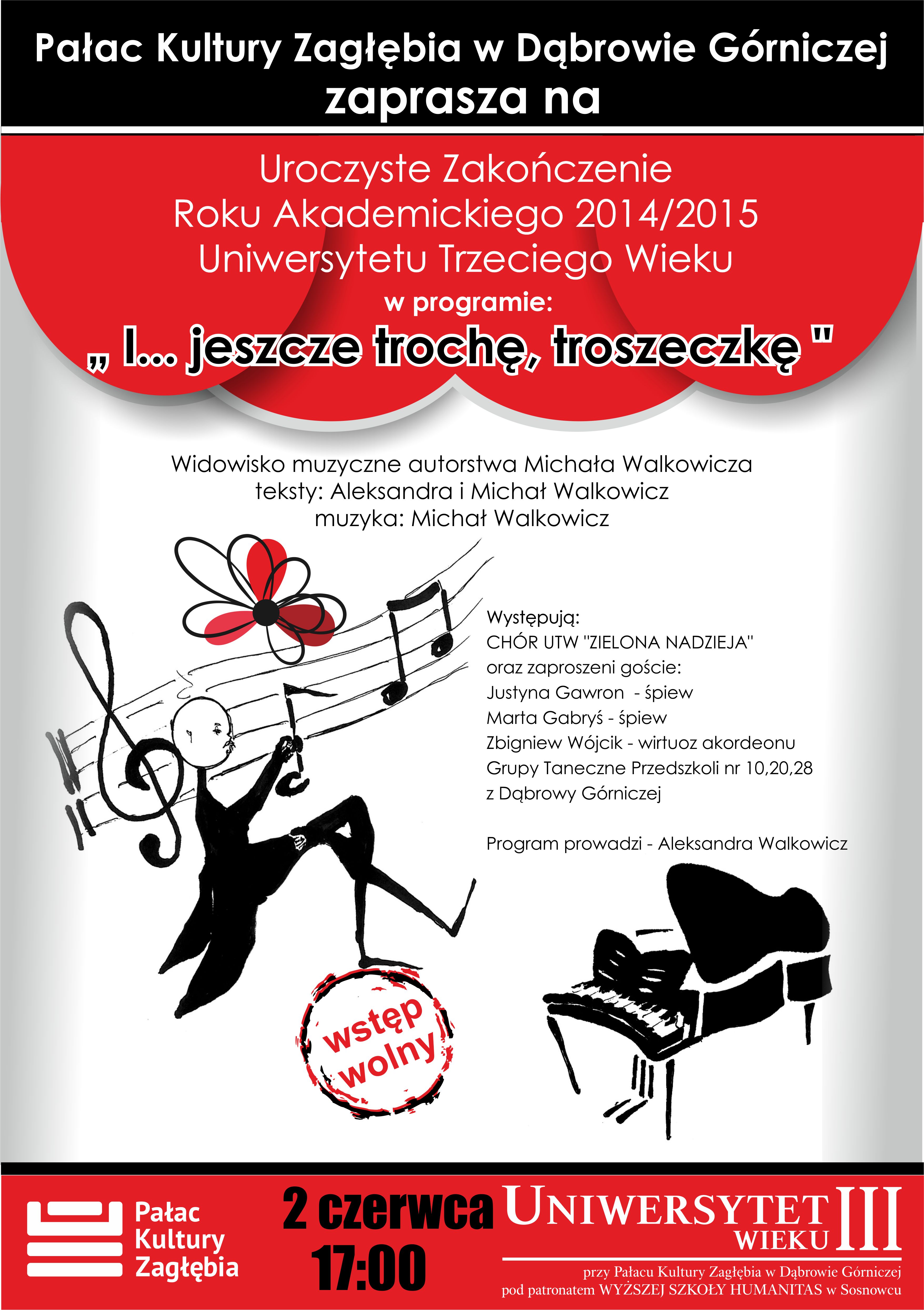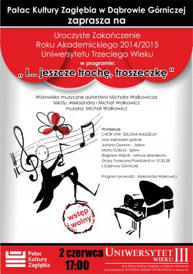 Pałac Kultury Zagłębia w Dąbrowie Górniczej, zaprasza 2 czerwca 2015 r. o godzinie 17:00, na uroczyste Zakończenie Roku Akademickiego 2014/2015 Uniwersytetu Trzeciego Wieku!