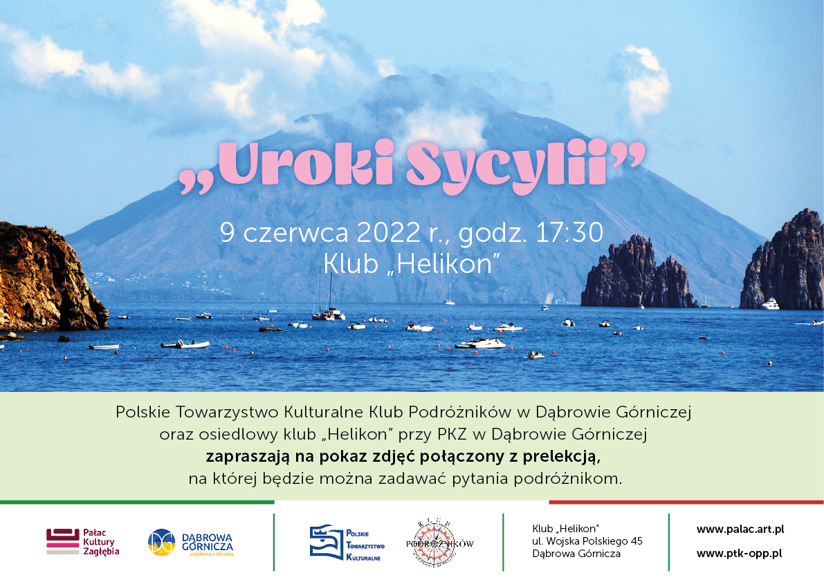 Polskie Towarzystwo Kulturalne Oddział Dąbrowa Górnicza oraz Klub Osiedlowy Helikon, działający przy PKZ w Dąbrowie Górniczej zapraszają na pokaz zdjęć i prelekcję, prowadzony przez Klub Podróżników. Spotkanie odbędzie się 9 czerwca o godzinie 17:30 w klubie Helikon. Tym razem podróżnicy zabiorą uczestników do słonecznej i tętniącej życiem Sycylii.