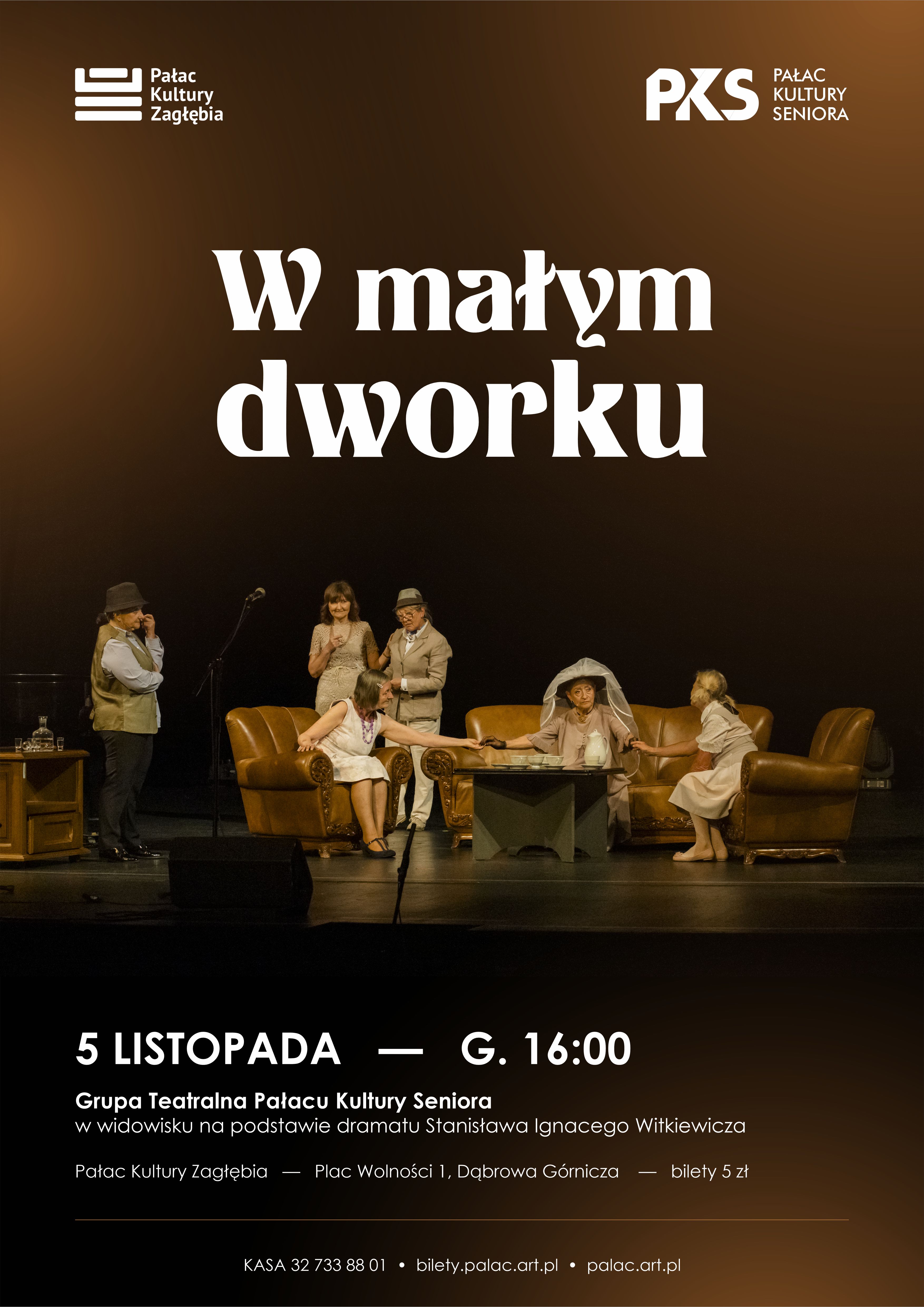 5 listopada o godz. 16:00 zapraszamy na prezentację sztuki Stanisława Ignacego Witkiewicza pt. "W małym dworku" przez seniorów uczestniczących w zajęciach teatralnych w ramach Pałacu Kultury Seniora.