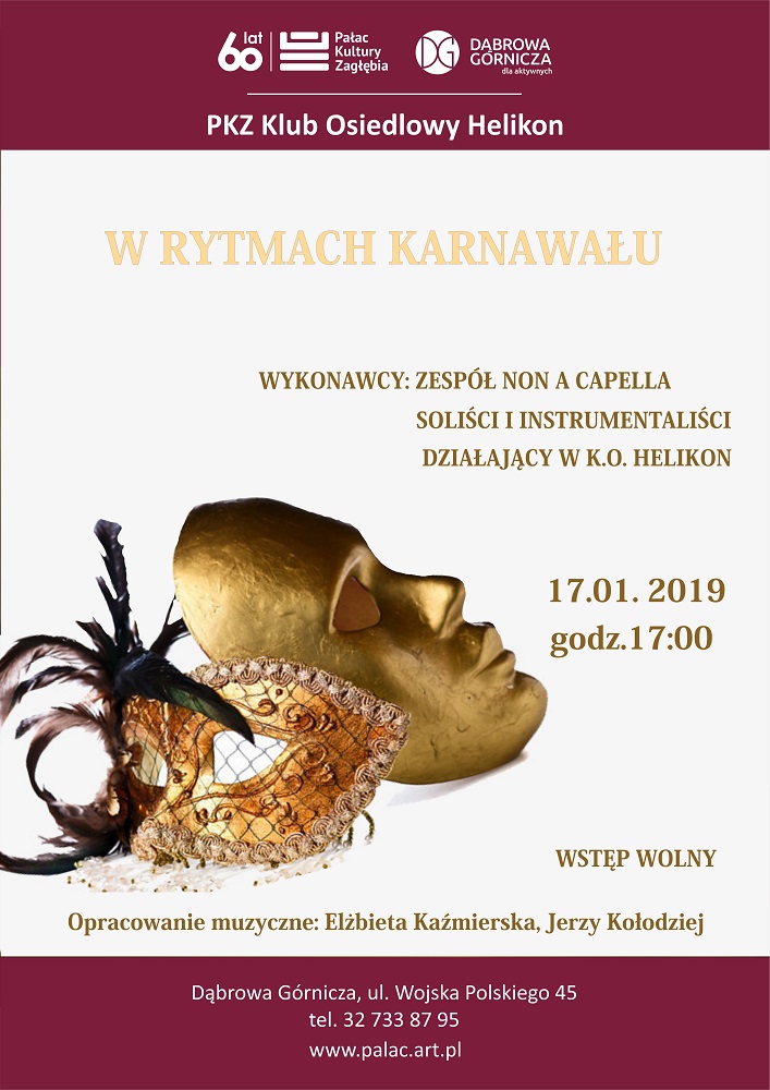 Klub Osiedlowy Helikon, zaprasza na koncert W rytmach karnawału, który odbędzie się 17 stycznia 2019 r. o godz. 17:00. Podczas tego energetycznego wieczoru usłyszymy wiele szlagierów, które królowały i wciąż królują na salach balowych podczas karnawału. Wykonawcami będą soliści i instrumentaliści działający w klubie pod czujnym okiem instruktorów - Elżbiety Kaźmierskiej i Jerzego Kołodzieja, którzy przygotowali cały program.