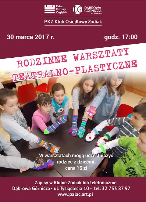 Z okazji zbliżającego się Dnia Teatru w Klubie Osiedlowym Zodiak odbędą się Rodzinne warsztaty teatralno-plastyczne. Na zajęciach wspólnie wykonamy pacynki i kukiełki oraz pobawimy się w miniteatr. Do zabawy zapraszamy też rodziców! Warsztaty odbędą się 30 marca o godz. 17:00. Zapisy oraz więcej informacji w klubie i pod nr tel. 32 733 87 97.