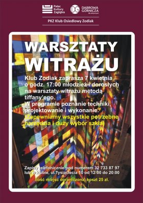 Klub Osiedlowy Zodiak organizuje warsztaty witrażu Wiosna wkoło dla młodzieży i dorosłych. Na zajęciach zaprojektujemy i wykonamy mały witraż o wiosennej tematyce np. motyla, ptaka, ważki. Zapisy i szczegółowe informacje w klubie oraz pod nr tel. 32 733 87 97. Warsztaty odbędą się 7 kwietnia o godz. 17:00.