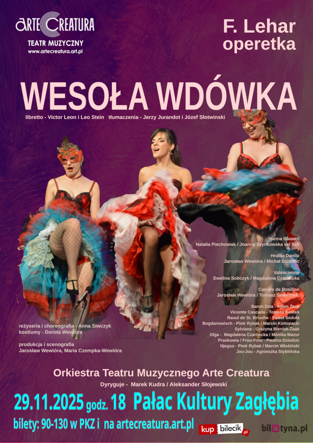 29 listopada o godz. 18:00 zapraszamy do Sali Teatralnej Pałacu Kultury Zagłębia na operetkę "Wesoła wdówka" w wykonaniu Teatru muzycznego Arte Creatura.