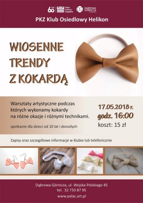 Zapraszamy młodszych (od 10 lat) i starszych na warsztaty do Klubu Osiedlowego Helikon, na których wykonamy kokardy różnymi technikami i na różne okazje. W programie m.in. kokarda jako spinka do włosów, na opaskę, jako broszka, do kwiatów, na prezenty. Zajęcia odbędą się 17 maja o godz. 16:00.
