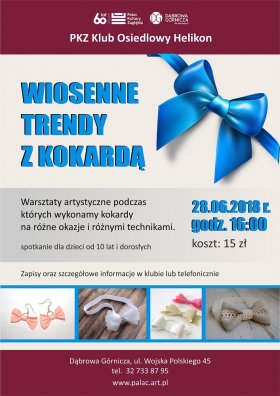 W związku z dużym zainteresowaniem warsztatami Wiosenne trendy z kokardą poraz kolejny zapraszamy do Klubu Osiedlowego Helikon. 28 czerwca godz. 16:00 będziemy kontynuować fantazyjne tworzenie kokard na każdą okazję i różnymi technikami.