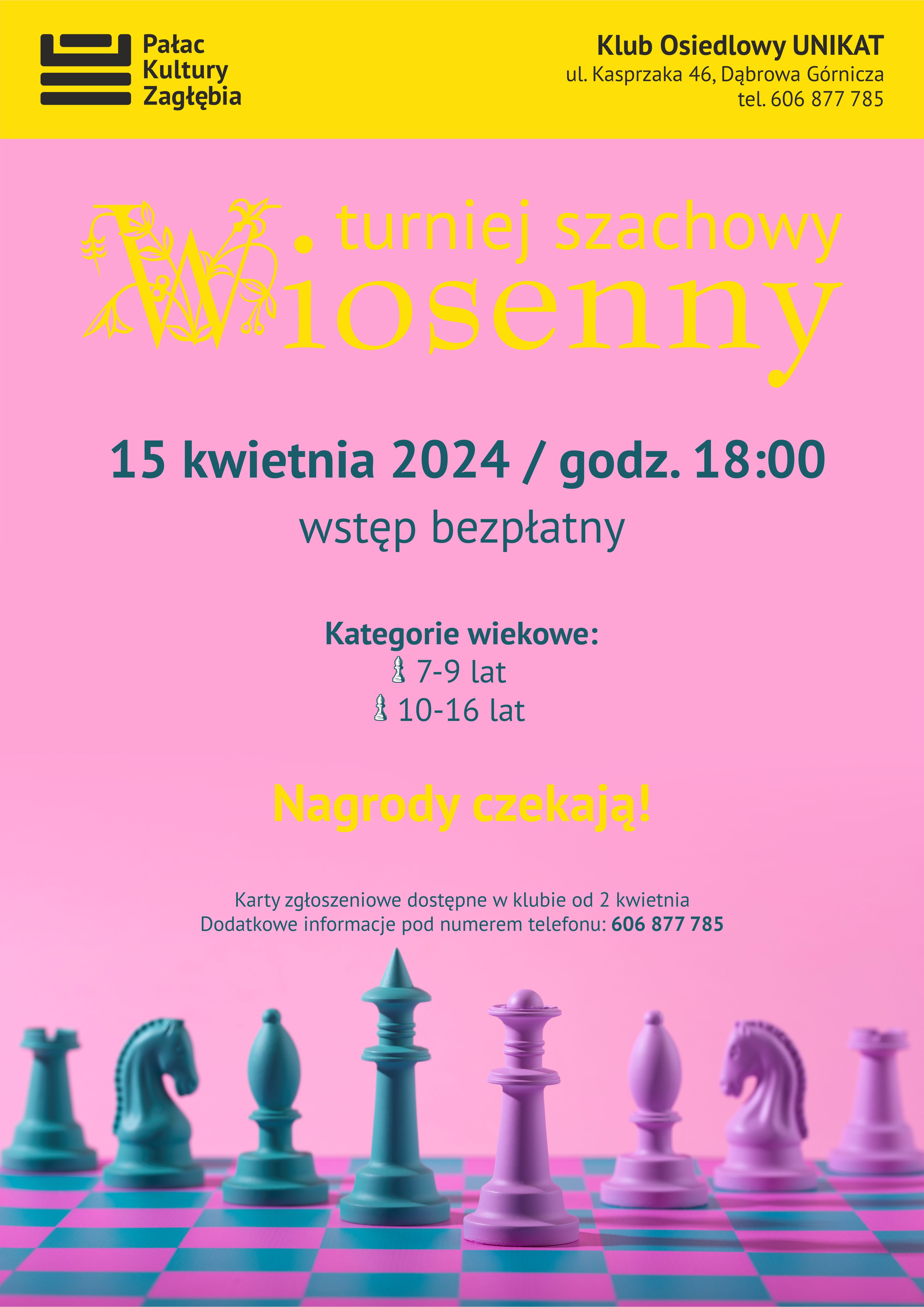 15 kwietnia o 18:00 w Klubie Osiedlowym Unikat odbędzie się Wiosenny Turniej Szachowy! Zgłoszenia w klubie od 2 kwietnia!