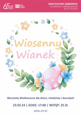 Zapraszamy serdecznie do udziału w rodzinnych warsztatach wielkanocnych Wiosenny Wianek. Na warsztatach uczestnicy wykonają wianek wiosenny za pomocą materiałów takich jak: sznurek, kółko styropianowe, materiał, juta, sztuczne kwiaty, jajeczka i kurczaczki. Będzie możliwość wykonania wianka w jednej z dwóch technik. Bardziej skomplikowana na szydełku i łatwiejsza z wykorzystaniem pasków materiału i kleju na gorąco. Warsztaty poprowadzą Maja Szwedzińska i Barbara Kochańska. Na warsztaty zapraszamy dzieci, młodzież i dorosłych. Można przyjść całą rodziną, kreatywnie i twórczo spędzić czas, a przy okazji wykonać piękną wiosenną ozdobę do swojego domu lub mieszkania.